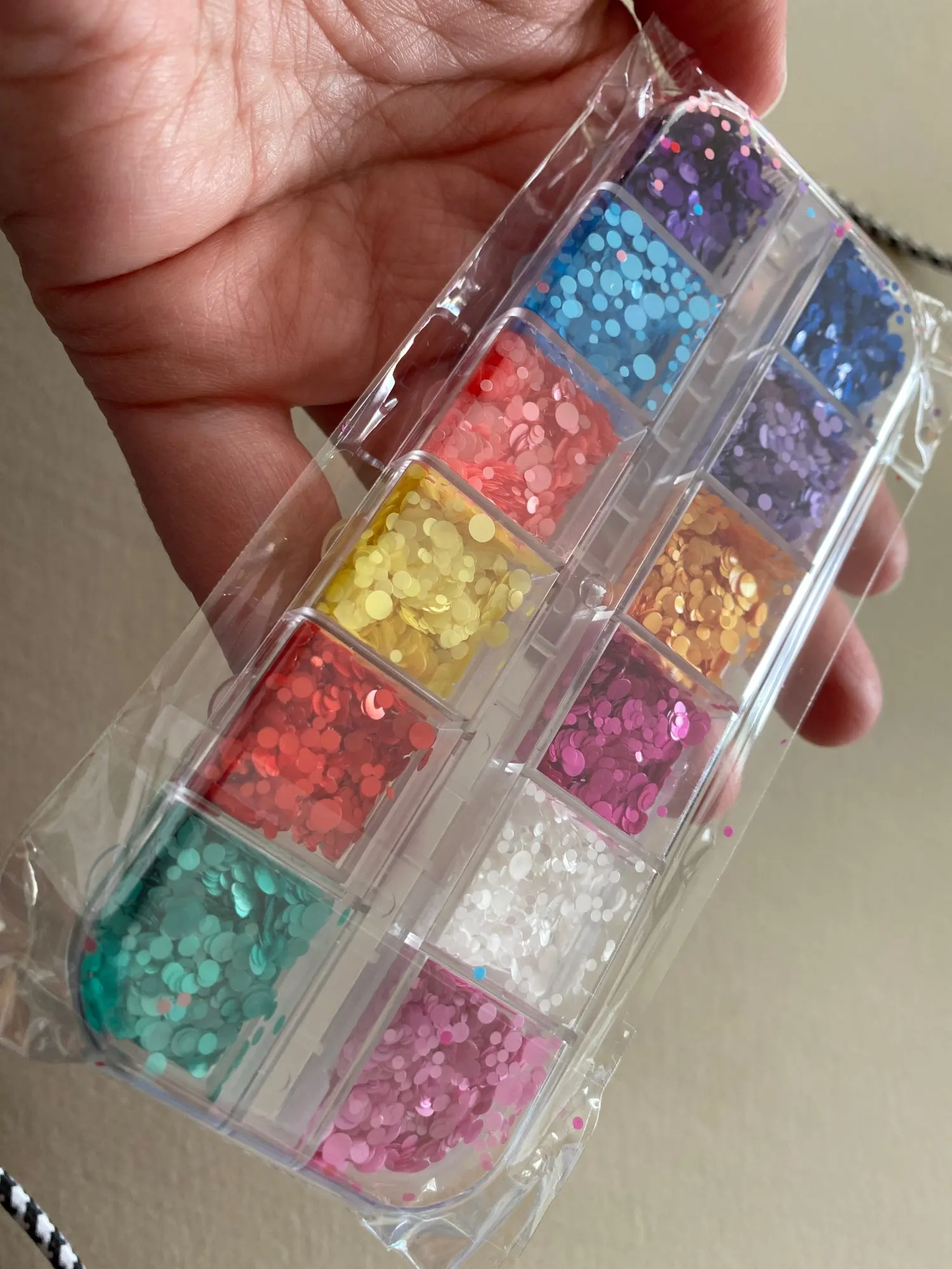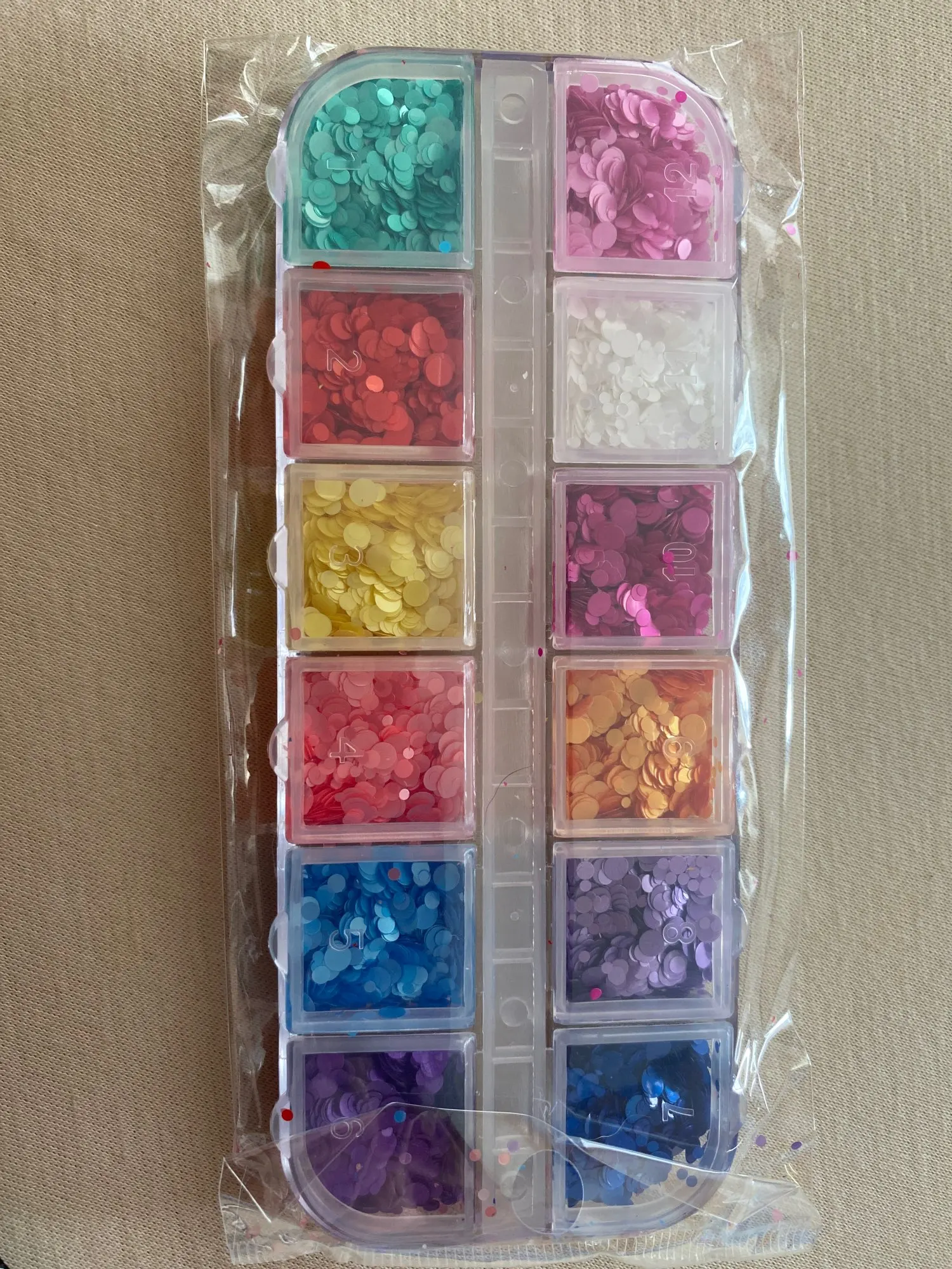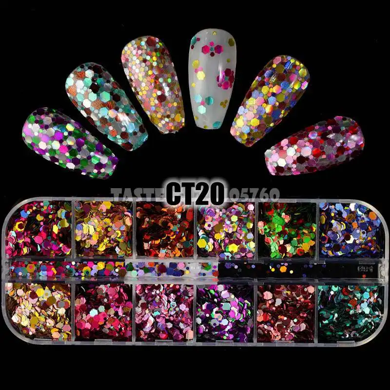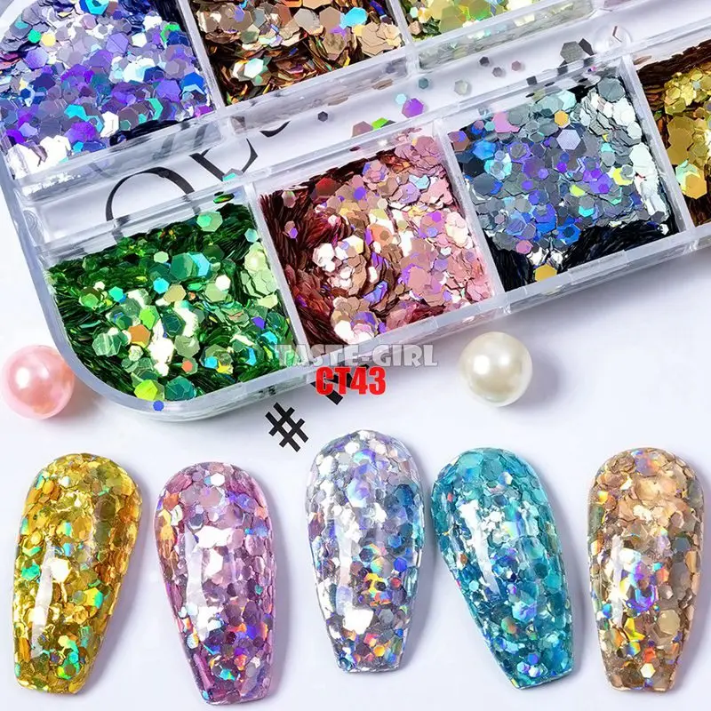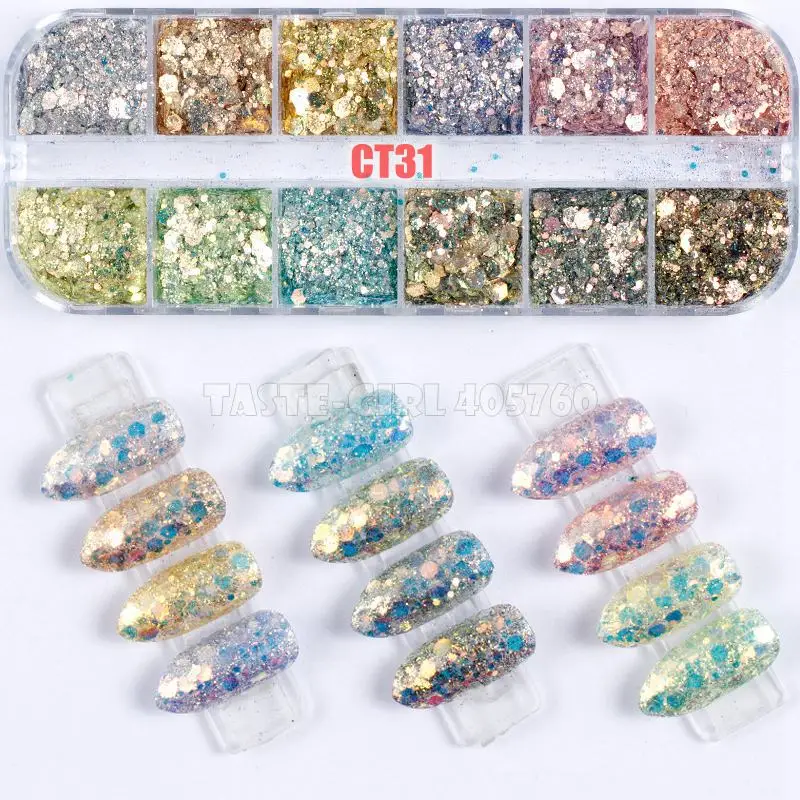12 ячеек в коробке, разные размеры, шелковые радужные круглые БлесткиHolo шестиугольные Блестки для ногтей, фосфоресцирующая пудра, наклейки для ногтей