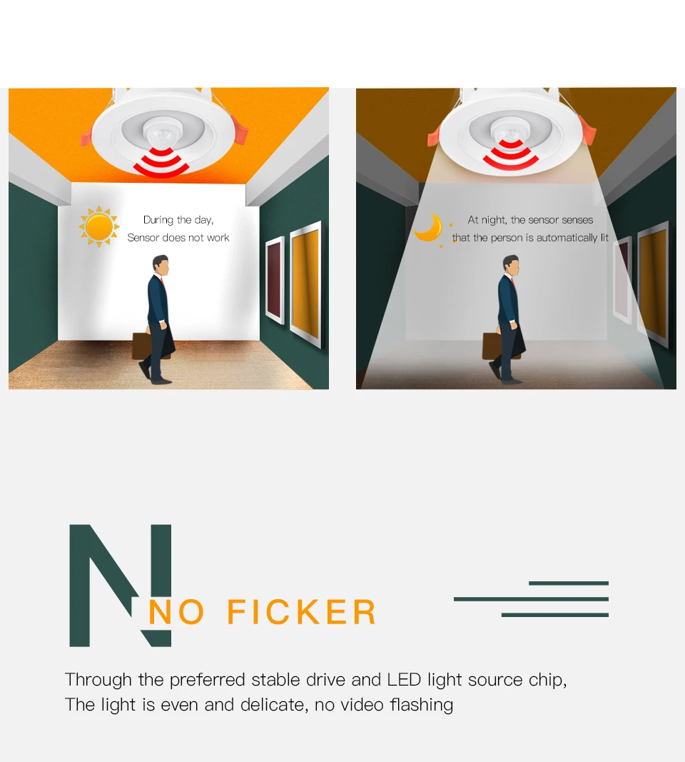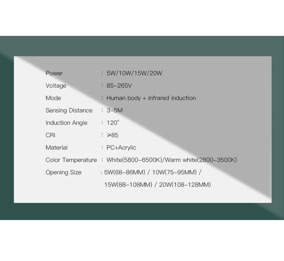 Параметры продуктаВходное напряжение: AC85-265V/Мощность: 5 Вт/10 Вт/15 Вт/20 ВтРежим: тело человека + Инфракрасная индукцияИндекс цветопередачи (CRI):>Ra85Расстояние срабатывания: 3-5 мСветовой поток: 80 ~ 100 лм/ВтЦветовая температура: теплый белый:(2800K-3500K); Белый:(6000K-6500K)Материал: Поликарбонат + акрилРазмер отверстия: 5 Вт (68-86 мм); 10 Вт (75-95 мм); 15 Вт (88-108 мм); 20 Вт (108-128 мм)Особенности продукта1. Светодиодный потолочный светильник использует постоянный Светодиодный источник питания (AC85-265V). Стабильная производительность, безопасность и надежность. Применяется во всех странах.2. Светодиодный потолочный светильник s, Защита окружающей среды, низкое энергопотребление, светоотдача и яркость освещения превосходят светодиодный светильник.3. Светодиодный потолочный светильник имеет защиту от излучения, функции защиты от тумана. Светильник мягкий, красивый внешний вид.4. Светодиодный драйвер, влагостойкий, изоляционный, высокотемпературный. Уровень безопасности IP525. Защита окружающей среды приятная на ощупь полупроводниковый светильник источник света, светильник, приятный цвет есть способствует Китайской Народной защита зрения и здоровья. Нет излучения, Нет ультрафиолетового излучения, нет стробоскопического излучения.6. CCC, CE, RoHS Сертификация (светодиодный) продукты, для вашей гарантированной безопасности, чтобы избежать электрического удара и пожарной опасности. 7. Энергосбережение на 45-70%, чем флуоресцентная лампа/галогенная лампа/лампа накаливания и длительный срок службы:>80000 ч.