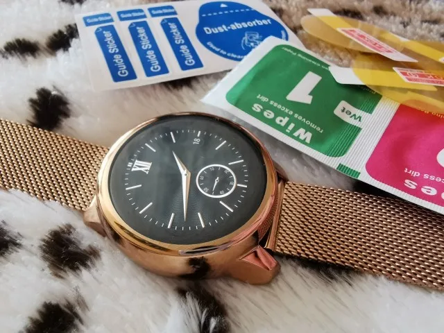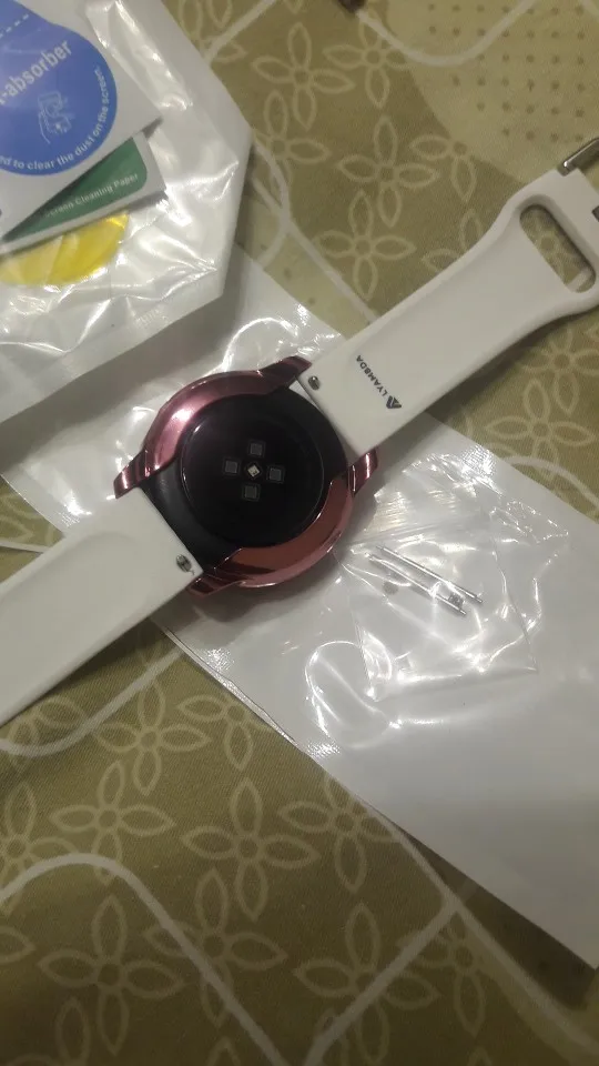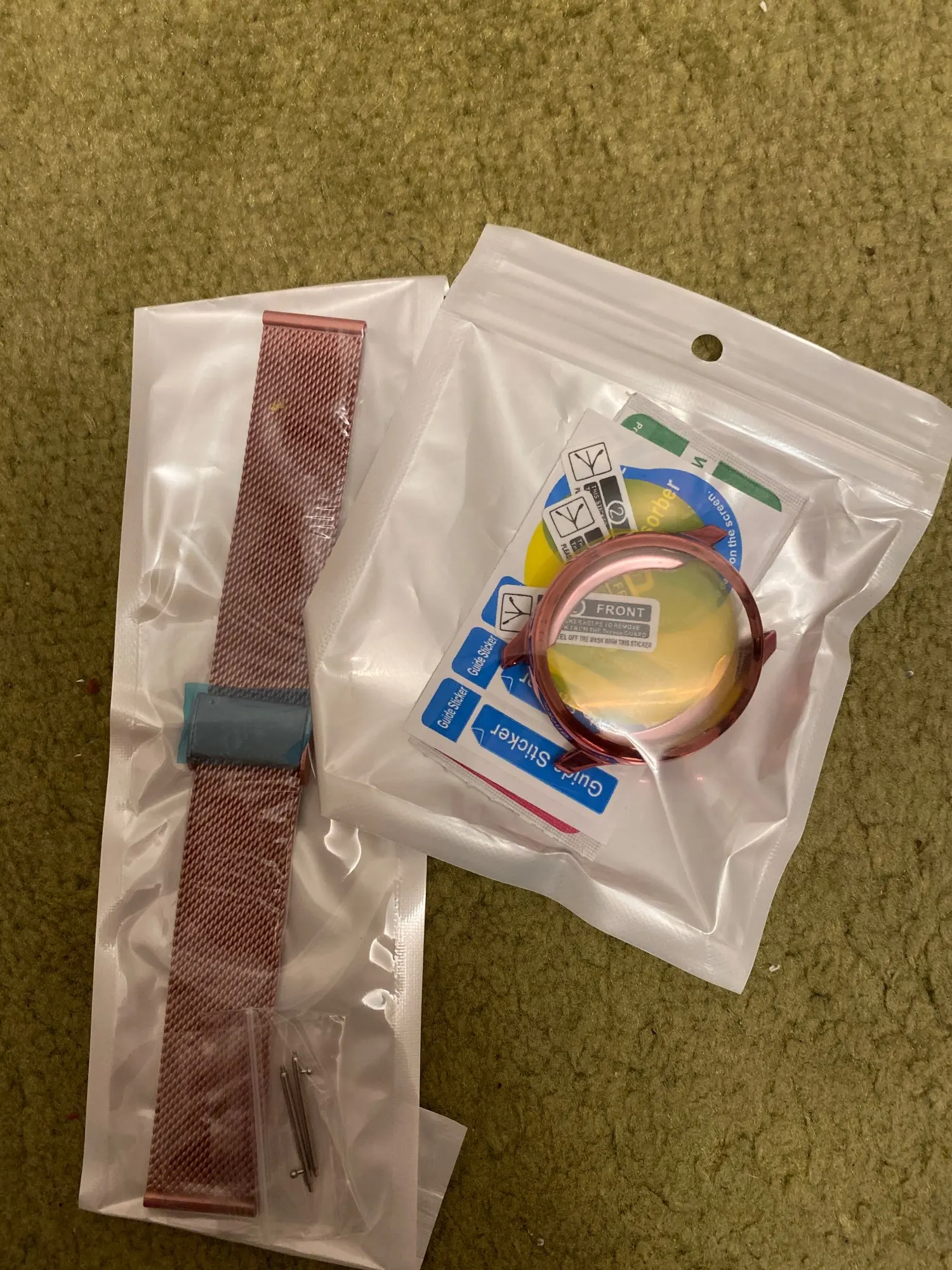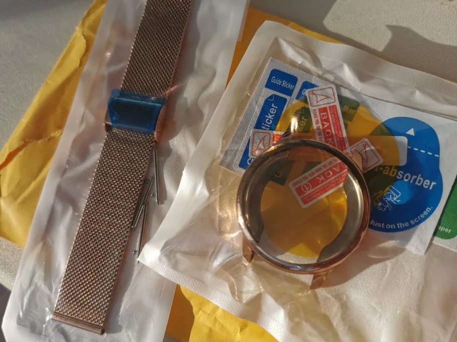 Доставка 30 суток с момента оплаты. Ремешок очень хороший, не трет руку, выглядит дорого, приятен на руке, застёжку немного подогнул пласкогубщия и ОК. Плёнки три в наборе, со второго раза наклеел ,отлично! Чехол на часы так себе, имеет небольшие пупырки по этому затемняет дисплей часов, ну если только смотреть время для девочки розовый то отлично!