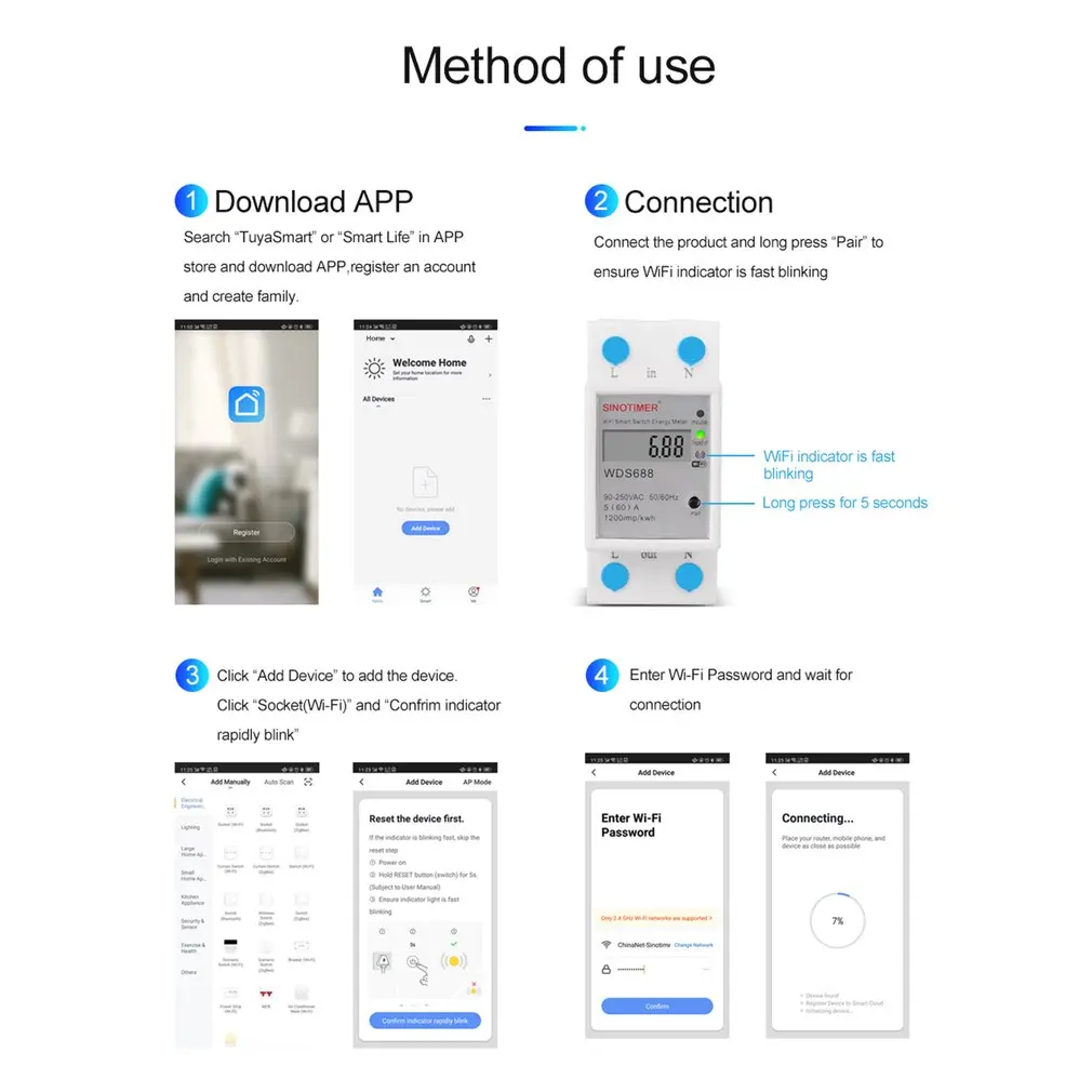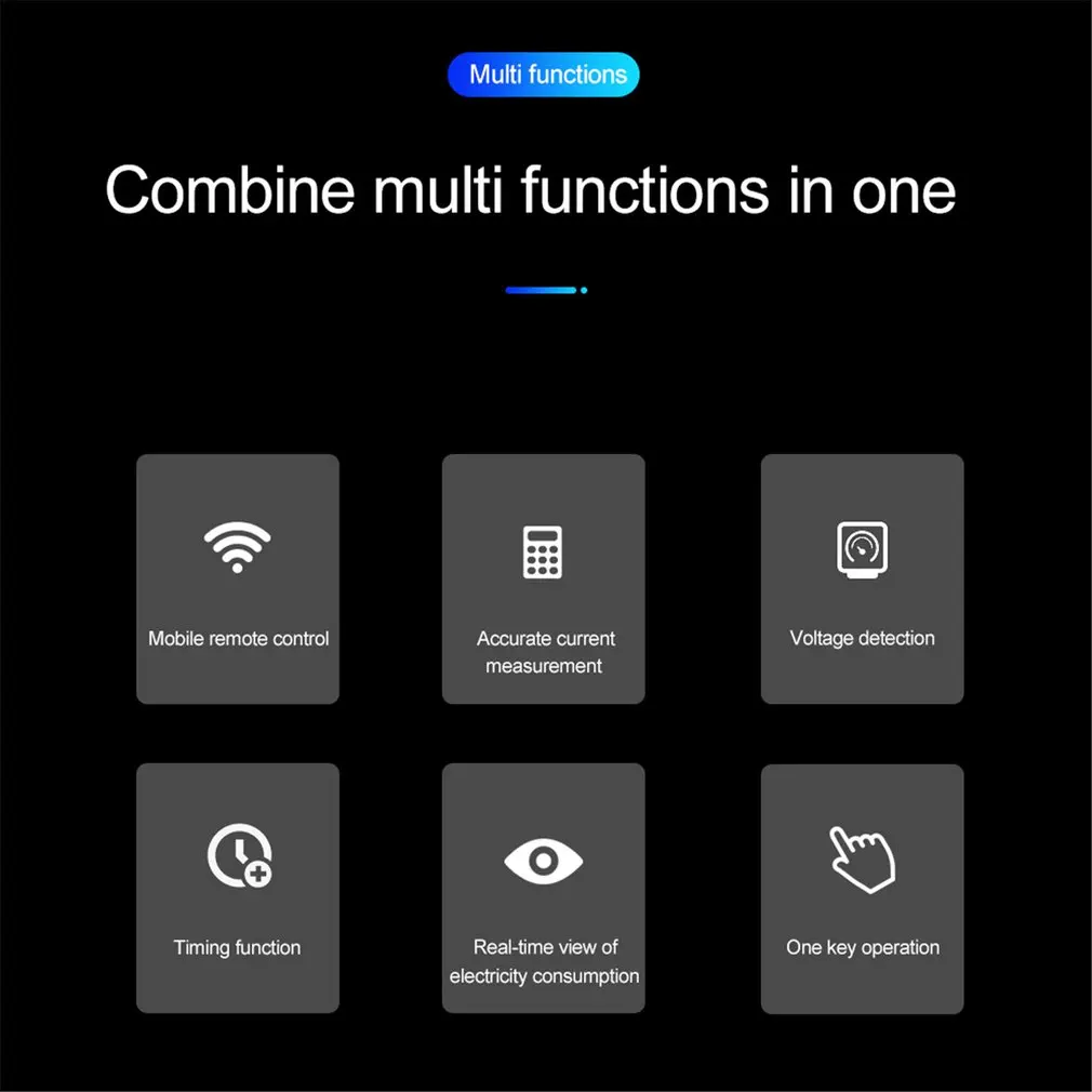 Особенности:1. Дистанционное управление вкл/выкл через приложение Tuya или приложение Smart Life в любое время из любого места.2. Рассчитать общее потребление.3. Просмотр энергопотребления в режиме реального времени через мобильный телефон.4. Расписание времени/таймер, 30 видов моделей таймера.5. ЖК-дисплей, отображение напряжения, тока, мощности, общей энергии кВт/ч в режиме реального времени.