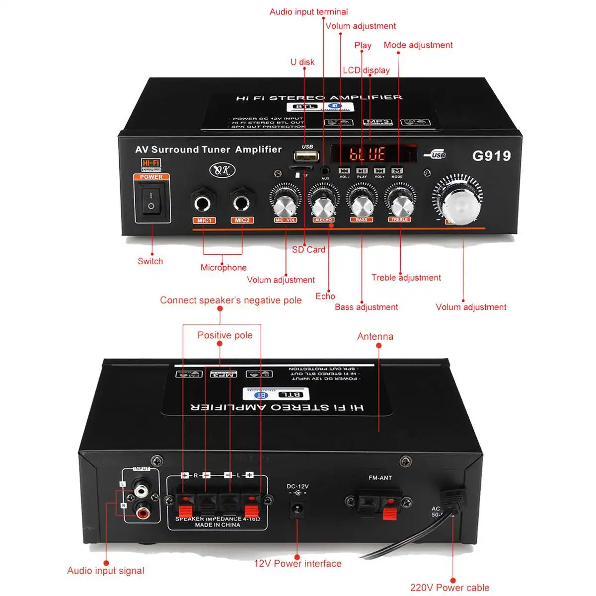 Посылка1 х аудио усилитель1 х пульт дистанционного управленияХарактеристики:Входное напряжение: 220 В переменного тока/12 В постоянного тока (в автомобиле)Вилка: европейская вилка (поставляется с адаптером в соответствии с вашей страной)Bluetooth: поддержкаВыходная мощность: 100 Вт + 100 ВтПиковая мощность: 180 Вт + 180 ВтКанал: 2 каналаСопротивление нагрузки: 4-8 ОмSNR: 85 дБЧастота FM: 87,5-108 МГцСтепень искажения: 0.05%Входная чувствительность: 0,25-5 ВИсточник питания RC: Батарея CR2025 (встроенная)Размер: прибл. 23x15x6 см/9,06x5,91x2,36''Особенности:-Цифровой мини-усилитель мощности звука Hi-Fi с bluetooth.-Встроенный ЖК-дисплей с функцией подсветки.-SD-карты, U-диск, воспроизведение в формате MP3, поддержка беспроводного соединения bluetooth.-Поддерживает FM стерео радио.-Два слота для микрофона, караоке-система в вашем доме или в машине.-С высокими частотами, басами и регулятором громкости, очень прост в использовании.-Низкое Искажение обеспечивает более четкий, мощный и мощный звук.-Два основных канала вывода.-С функцией дистанционного управления.-Питание постоянного/переменного тока, подходит для дома или вашего автомобиля.