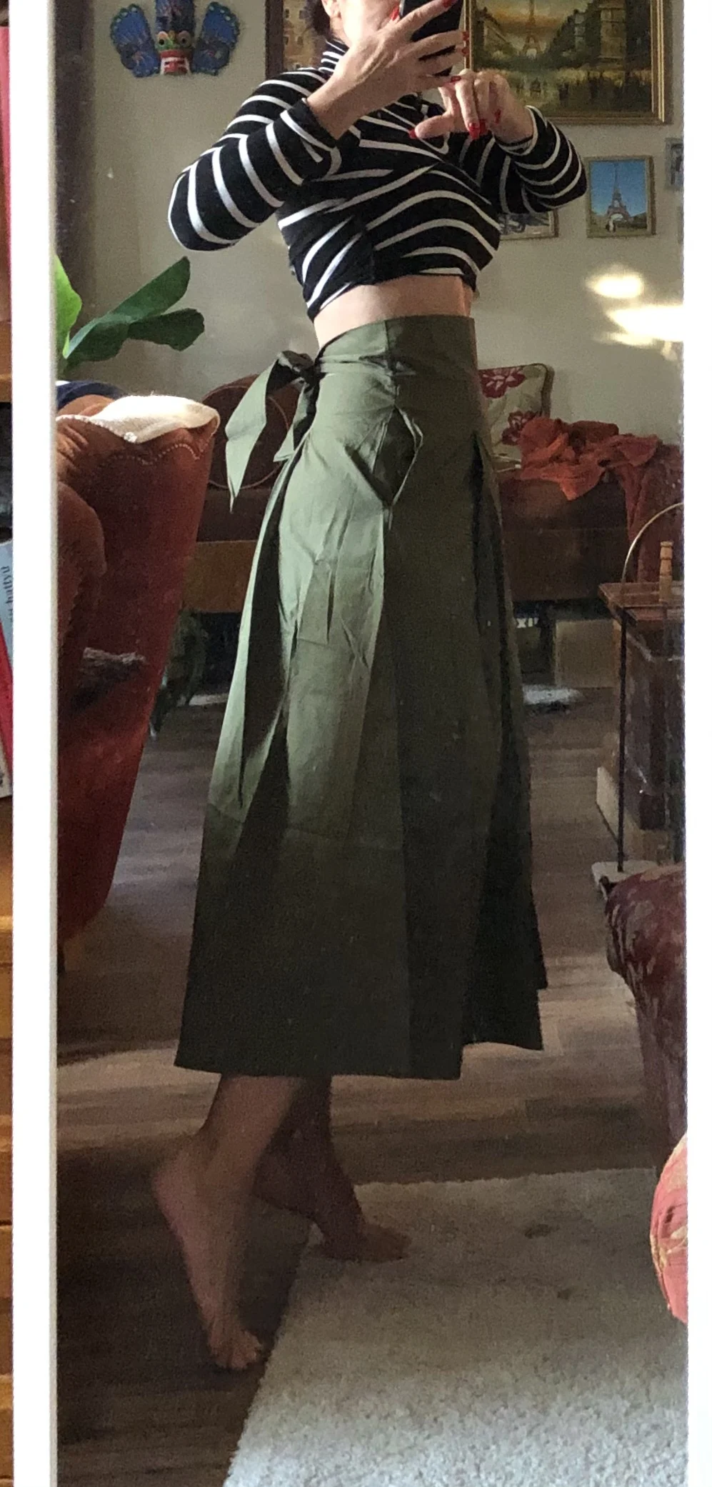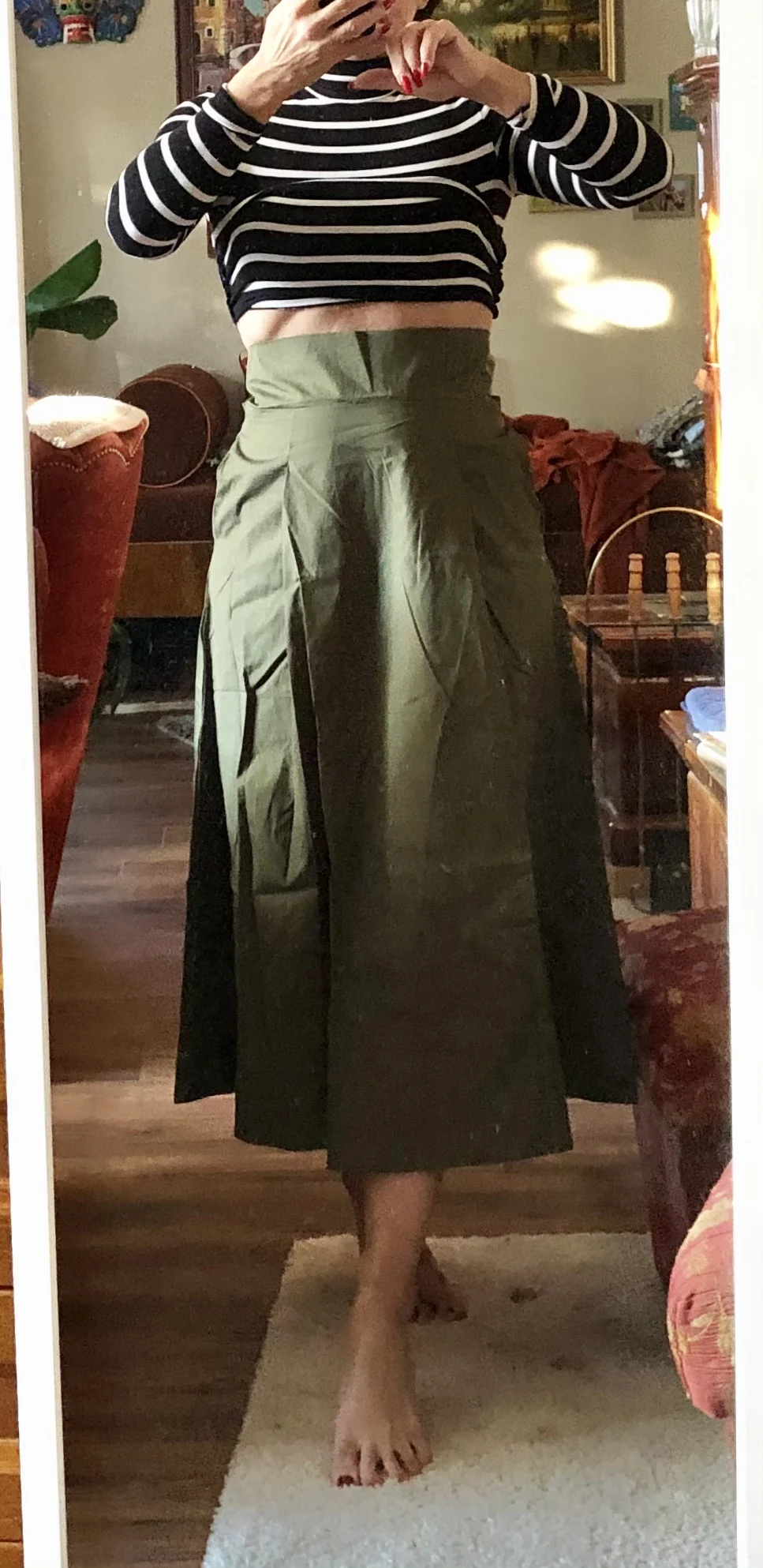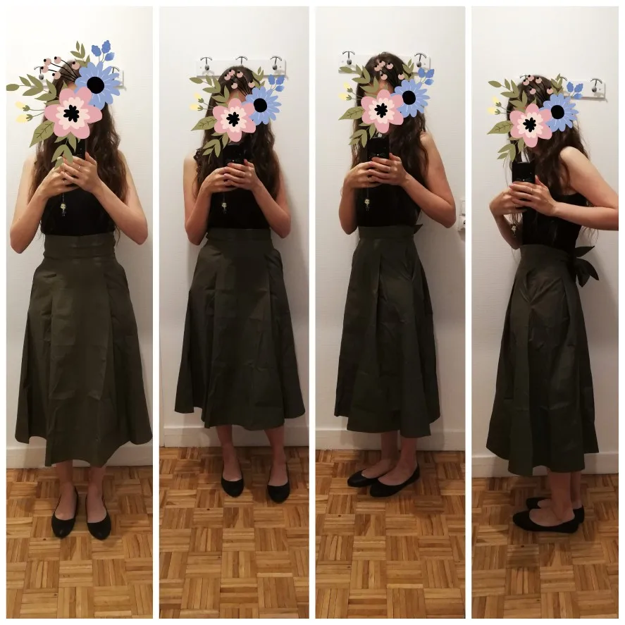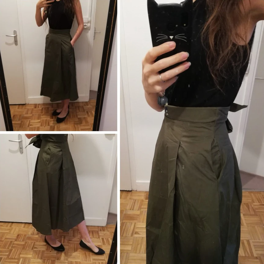 Неплохая юбка. Сшито довольно аккуратно, на мой взгляд. Для меня в этой юбке два недостатка - торчащие карманы по бокам и слишком высокий пояс, они делают силуэт странным, если смотреть спереди. Я подогнула пояс наполовину, так смотрится лучше, на мой взгляд (на первом фото пояс полностью, на других иногда подогнут). Размер М подошёл идеально, мои параметры: 85-66-93 см. При моём росте 171 см, длина юбки примерно до середины голени. Во Францию заказ пришёл за 11 дней.