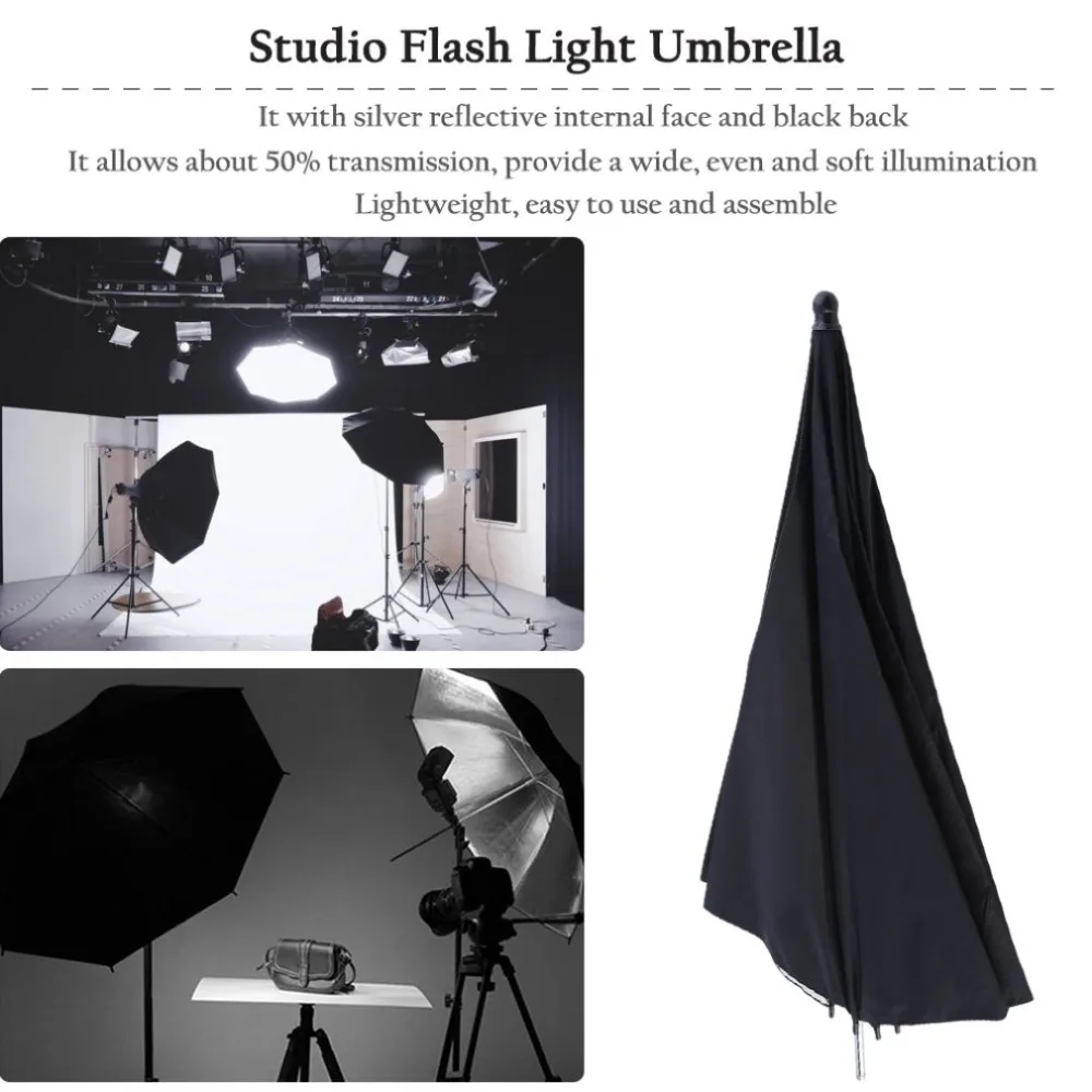 1. Это 33 дюймовый студийный светоотражающий двухслойный зонтик черного и серебристого цвета.