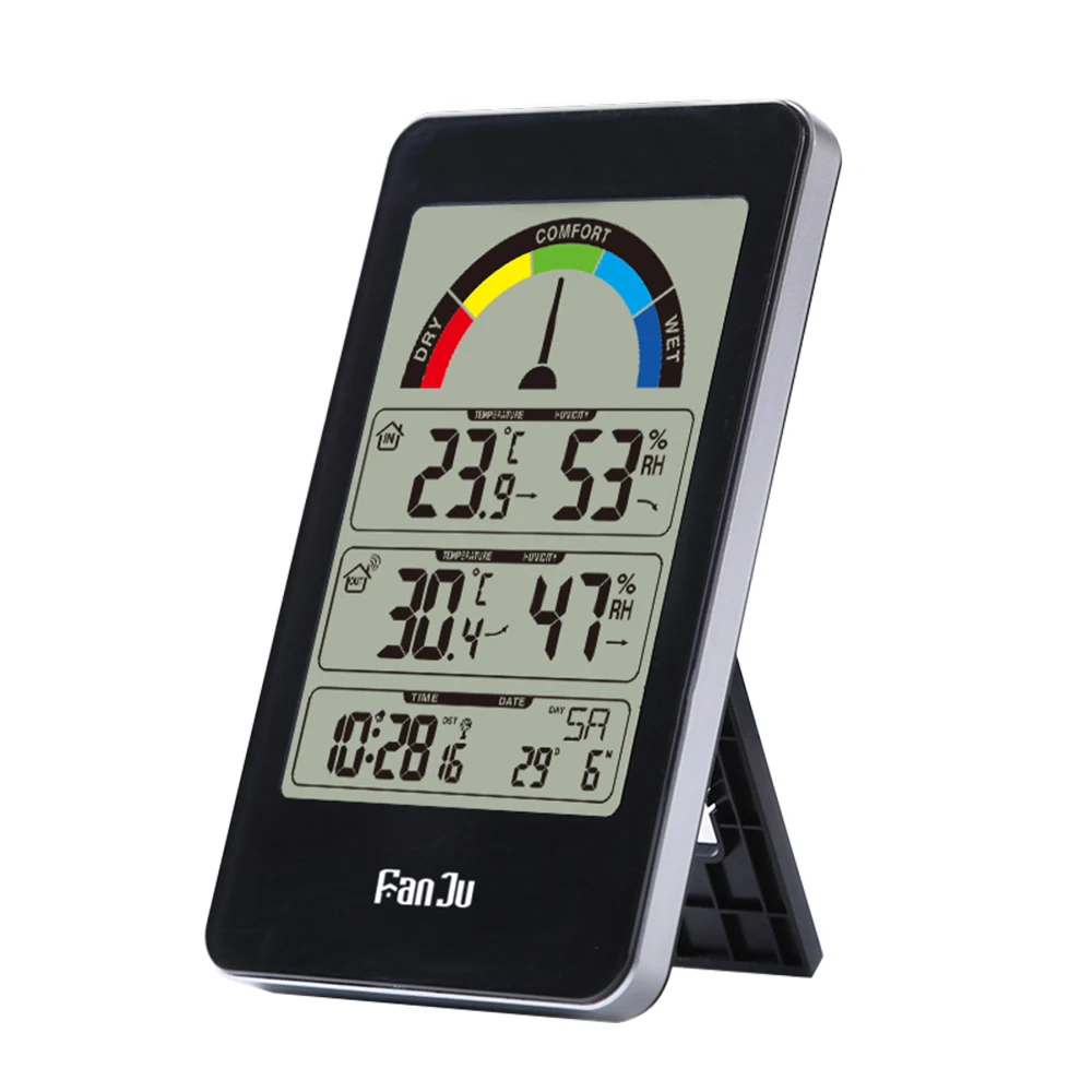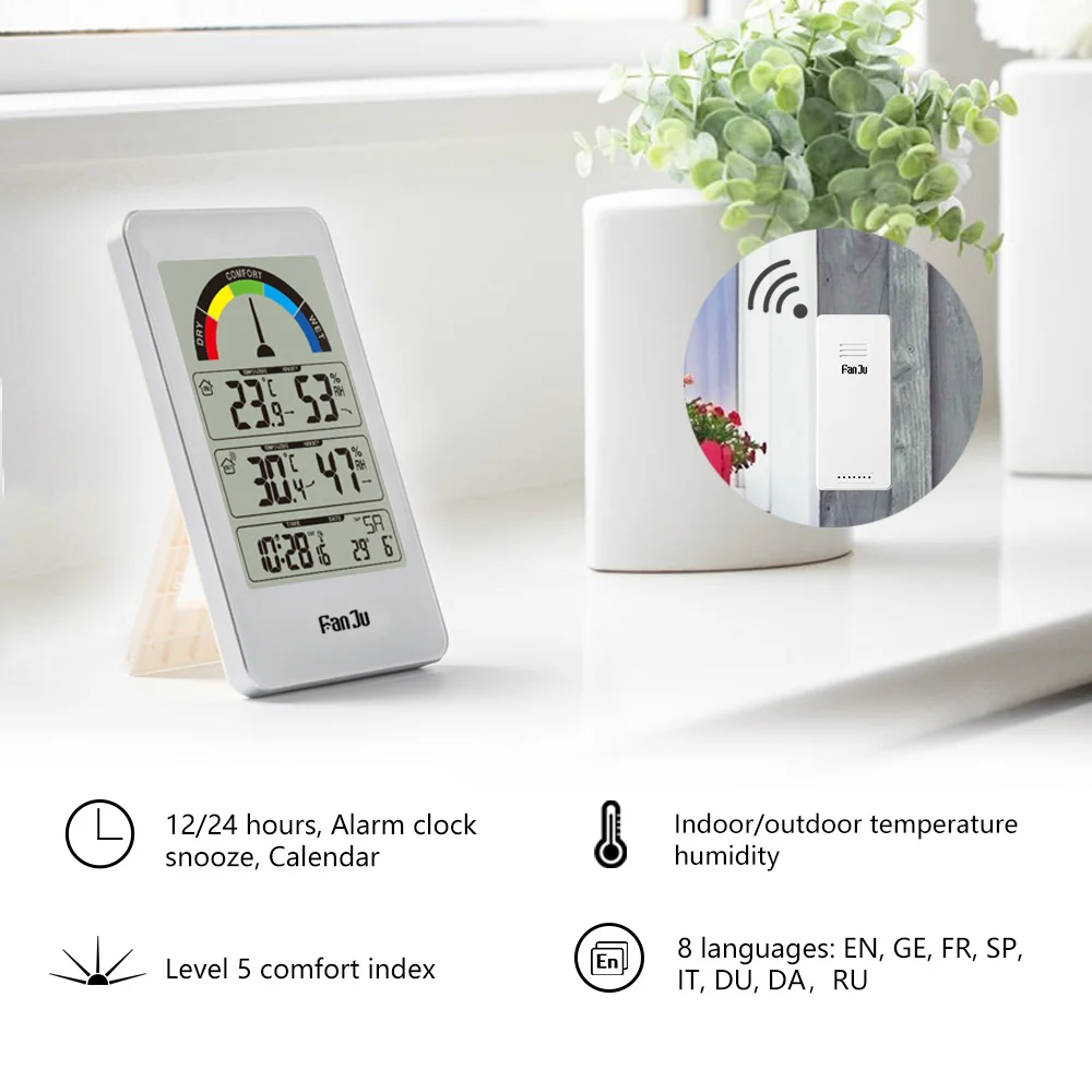 Особенности:Повседневные часы/будильник/функция календаря:Perpertual календарь до 2099 года; Дней недели на 8 языках выбор пользователя: английский, немецкий, итальянский, французский, русский, испанский, Нидерланды и Датский; Время в опциональном формате 12/24 часов.Гигротермотограф:-- Измерение температуры:Крытый Диапазон измерений:-9,9 ℃ ~ + 50 ℃ (15 ℉ ~ 122 ℉); Измерение внутри и снаружи диапазоны: -20 ℃ ~ + 60 ℃ (от-4 ℉ ~ 140 ℉). Высокая точность: 0,1 ℃.-Измерение влажности:Внутренний и наружный измеряемый диапазон: 20% RH ~ 95% RH. Высокая точность: 1% RH.Указатель комфортного климата в помещении.Он также имеет функцию наружной температурной сигнализации.Отображение температуры и влажности. Отображение минимального/максимального значения влажности и температуры.Функция радиоуправления DCF (только для Германии, пожалуйста, игнорируйте функцию для других контактов и повторений).Поставляется с беспроводным наружным датчиком, настенной или настольной подставкой. Частота радиочастотной передачи 433,92 МГц,60 метров дальность передачиНа открытой местности.Характеристики:Бренд: FanJuМодель: FJ3356Цвет:Черный, белый (опционально)Совместимая модель батареи: гигротермотограф Основной блок: 2 * LR03 AAA батарея; Беспроводной датчик на открытом воздухе: 2 * LR03 AAA батареяГигротермограф размер основного блока: 16,5*5,5*12,5 см/6,5*2,2*4,9 дюймовБеспроводной открытый сенсором Размеры: 9,6*3,4*5 см/3,8*1,3*2 дюймаПосылка Размеры: 14,5*9*5,5 см/5,7*3,5*2,2 дюймовПосылка Вес: 241g/8,5 ozПосылка:1 * гигротермограф Основной блок1 * Беспроводной уличный датчик1 * USB кабель1 * Руководство пользователя (на английском языке)Примечание:Батарейки в комплект не входят.