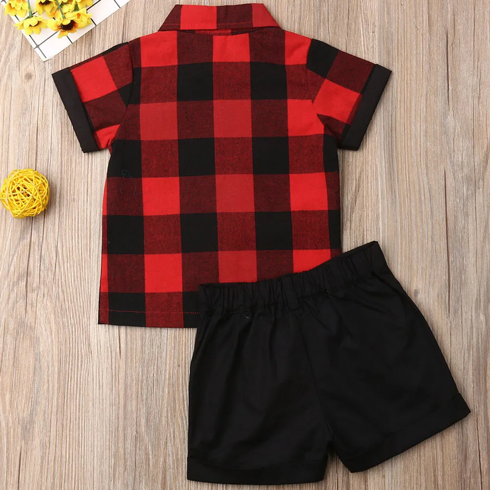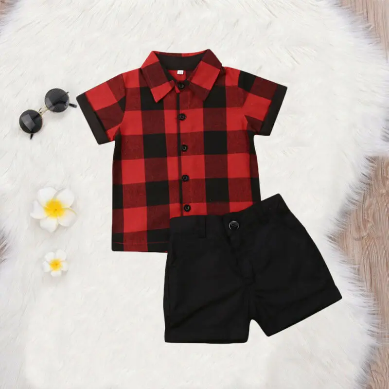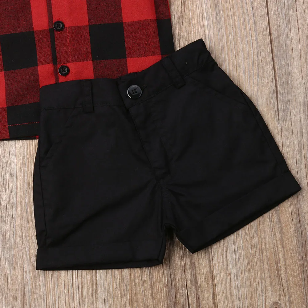 Комплект летней одежды 2019 одежда для малышей мальчиков и девочек, комплект из 2 предметов, одежда для маленьких джентльменов, осенняя рубашка в красную клетку, топы, черные шорты комплект вечерние официальная одежда