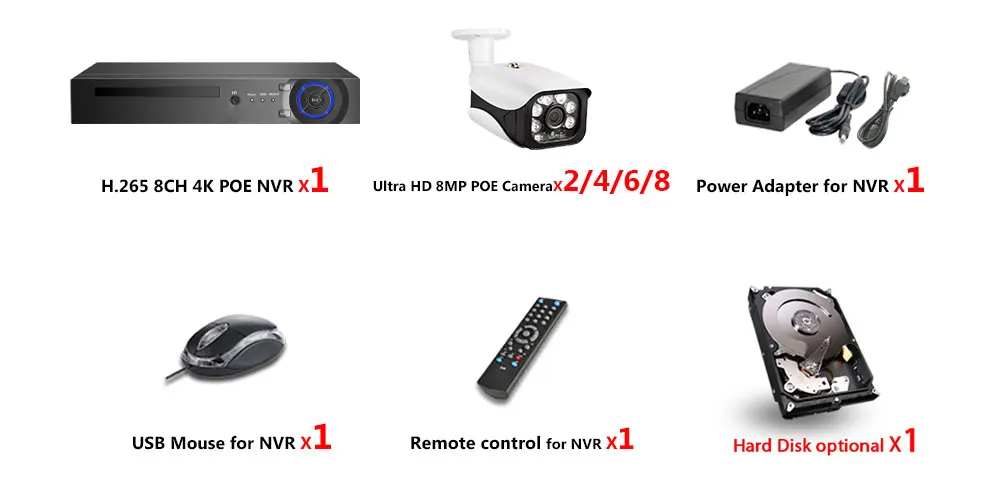 1 сетевой видеорегистратор 8CH 4K POE NVR;2/4/6/8 X HD POE IP 8.0MP для дома и улицы ИК Ночного Видения Всепогодные камеры;1 X Блок питания для NVR;1 х USB мышь для NVR;1 компакт-диск программного обеспечения для NVR;1 пульт дистанционного управления для NVR;Жесткий диск опционально!