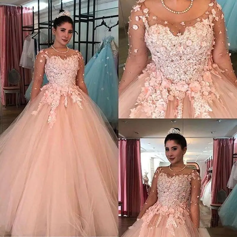 Кружевное бальное платье с объемным рисунком, платья для Quinceanera 2020, румянево-розовые прозрачные платья с длинным рукавом, конфетные платья 16 цветов, Дебютант для 15-летнего выпускного вечера