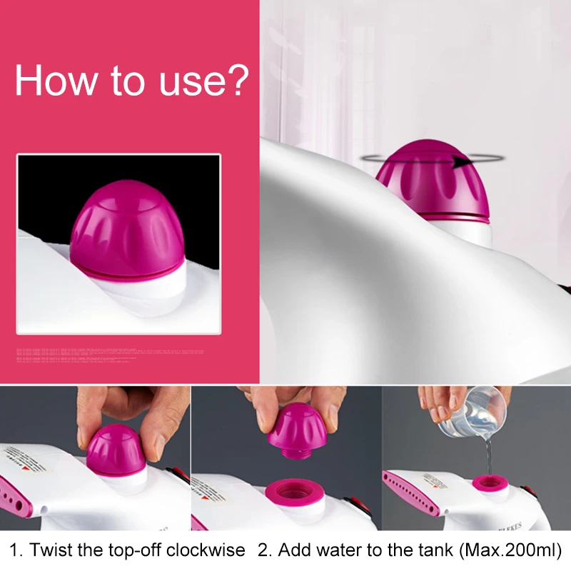 Как использовать-- Шаг 1: поверните верх по часовой стрелке, затем добавьте воду в бак и прикрутите верхнюю часть. (Примечание: вода не должна превышать максимальный указанный уровень)-Шаг 2: Включите питание через ручку. Красный светодиодный светильник будет светиться, когда отпариватель включится.-- Шаг 3: через 80 секунд вода нагревается, и вы готовы гладить!-Шаг 4: после использования, пожалуйста, выключите питание и отсоедините пароход от розетки. Упакуйте его куда угодно!