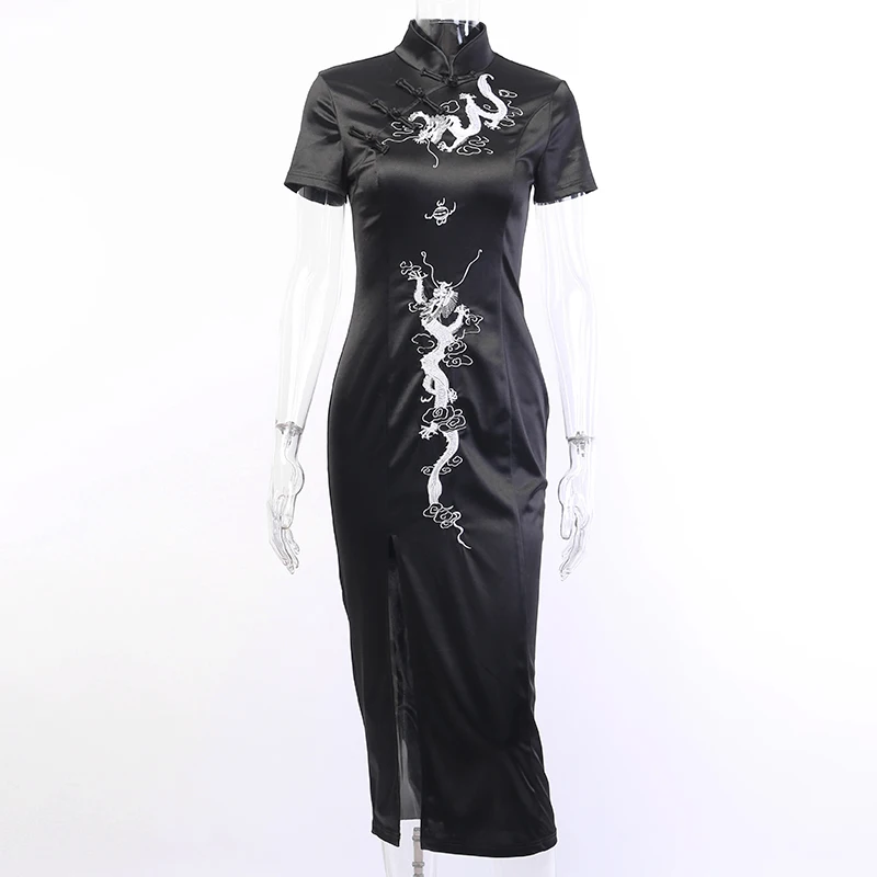 Женское винтажное платье-Ципао с вышивкой, готическое черное облегающее вечернее платье с коротким рукавом, воротником-стойкой и высоким разрезом