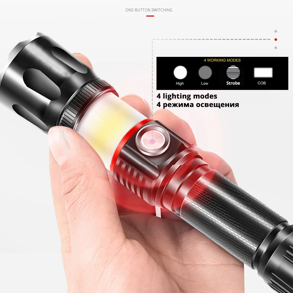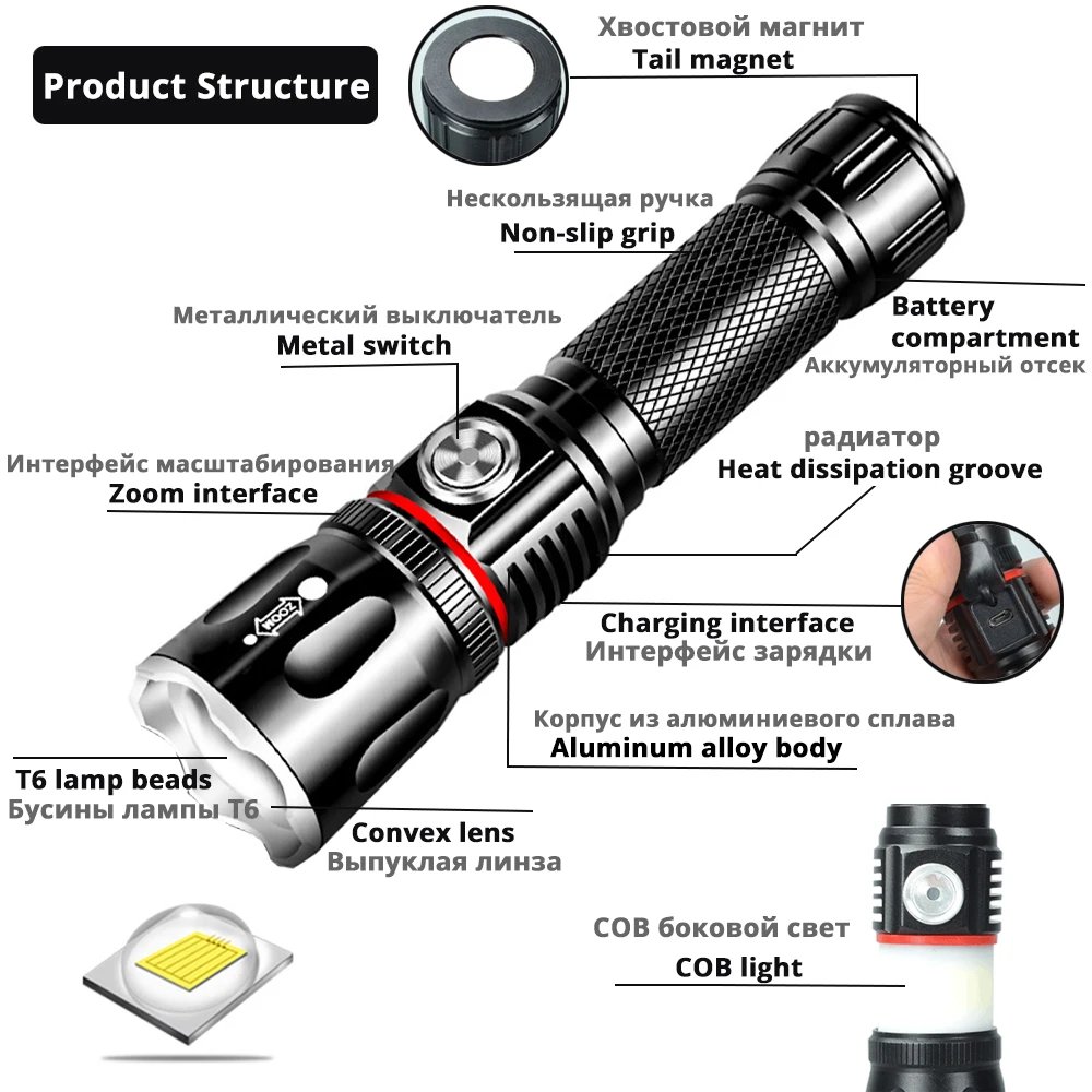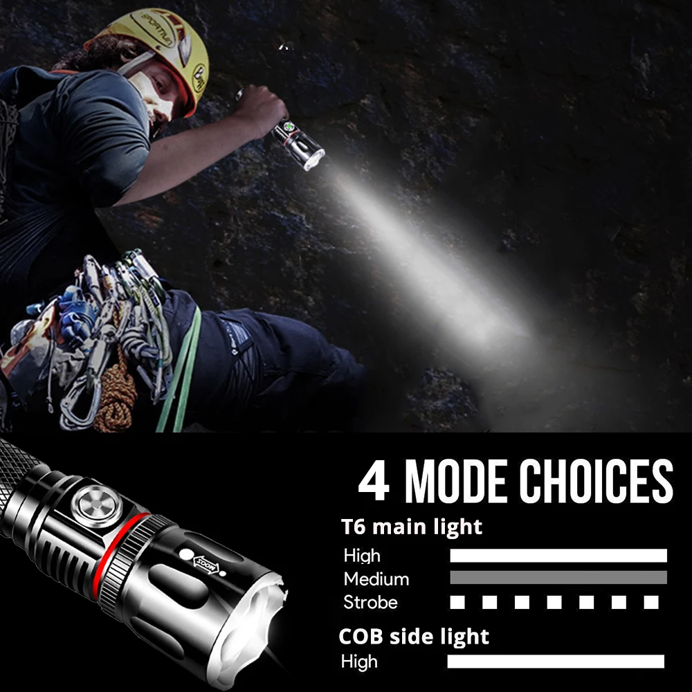 Основной светильник T6 (Высокий/низкий/Стробоскоп) Боковой светильник COB (обычно горит)