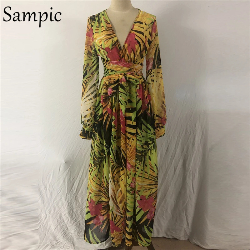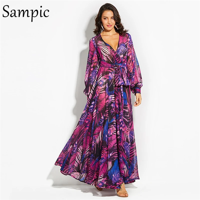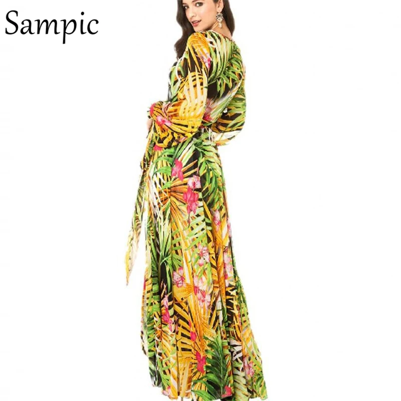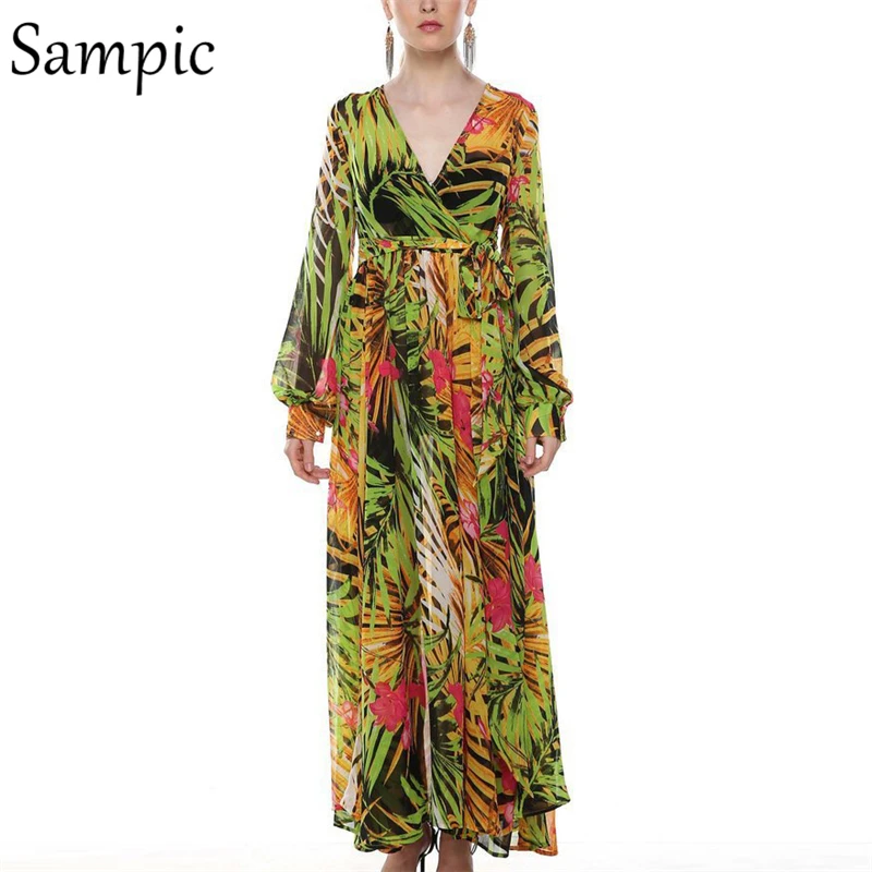 Женское шифоновое вечернее платье Sampic вечерние длинным рукавом и V-образным вырезом, повседневное пляжное длинное платье макси в стиле бохо с цветочным принтом, лето-осень 2019