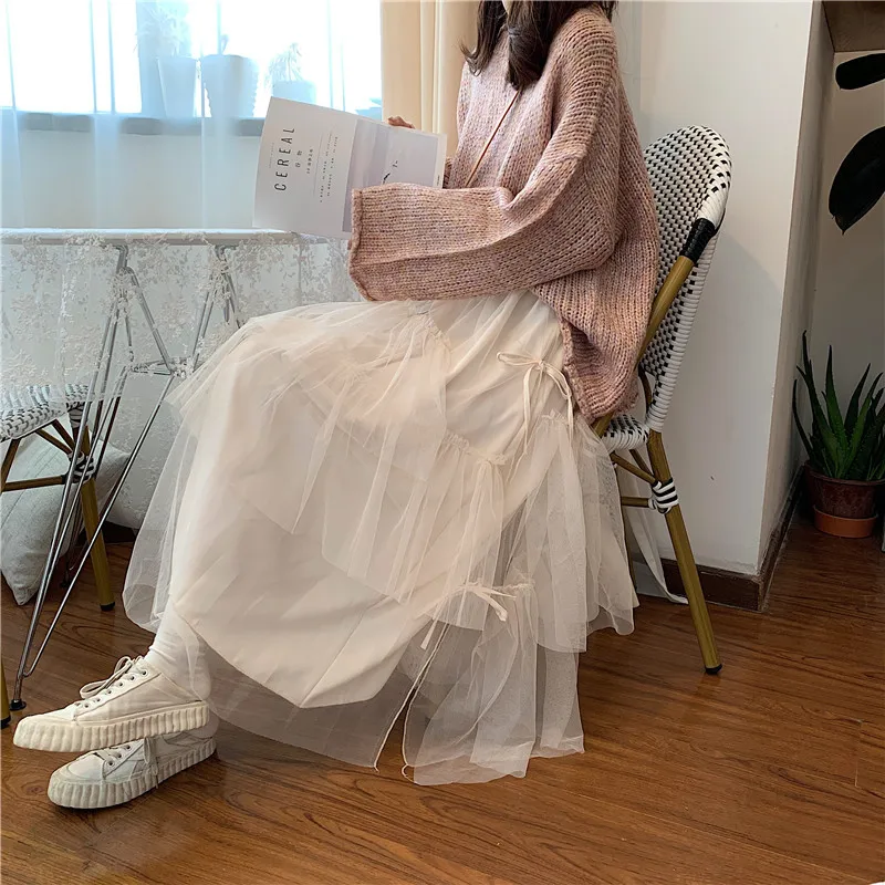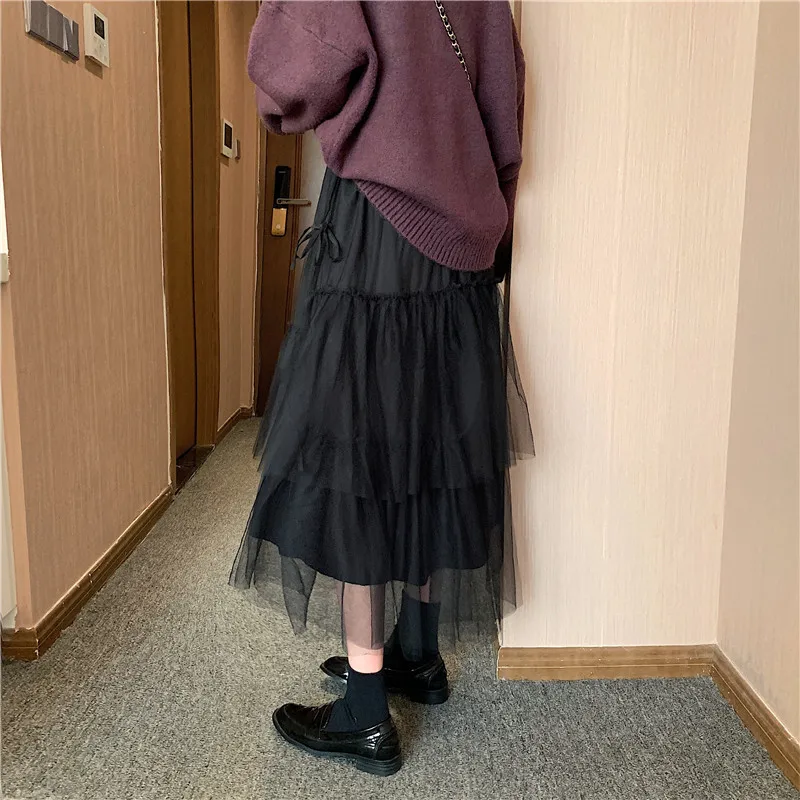 Женская сетчатая юбка миди в Корейском стиле, праздничная юбка-пачка с высокой талией в стиле ретро, необычная пышная Длинная черная юбка из тюля