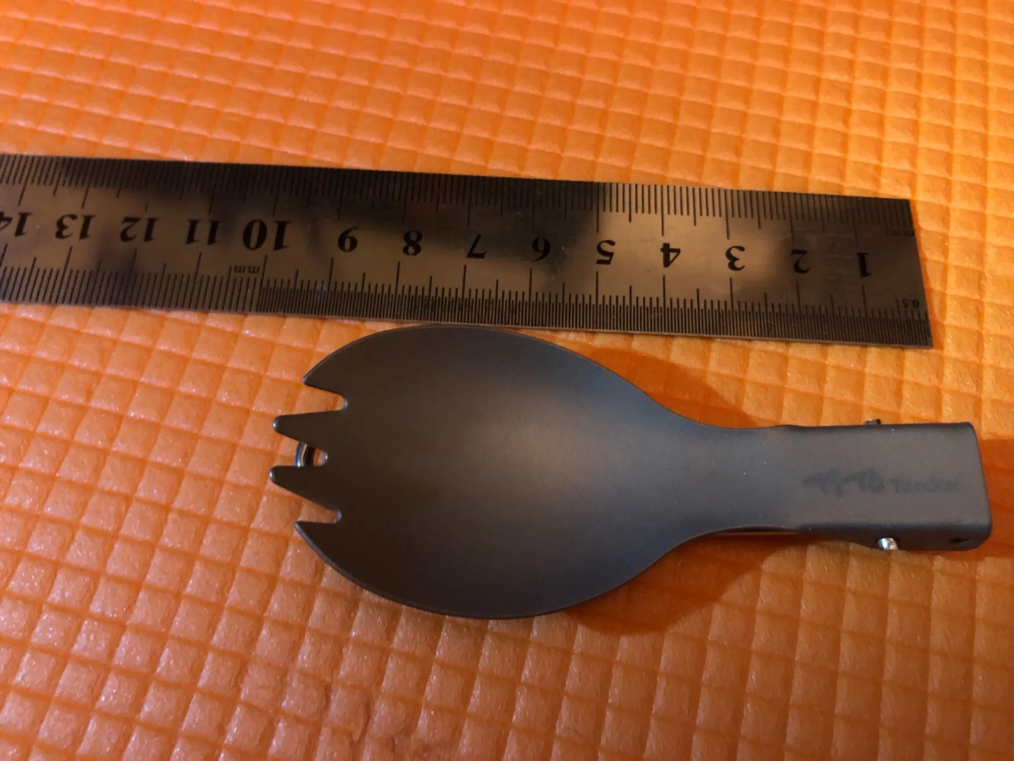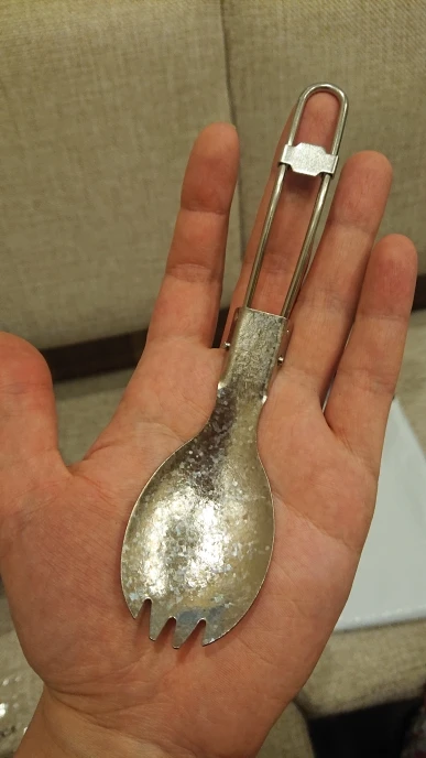 + Титановая, складная, лёгкая. + Поставляется в приятном тканевом чехольчике - там, где черпак ложки переходит в ручку, металл идёт плоский без загибов и рёбер жесткости. Из-за этого ложка в данном месте очень легко гнётся даже от небольшой нагрузки. Есть ею, конечно, можно, но, например, отскребать отстатки присохших за ночь макарошек уже рискованно. - Мелковата. Нечто среднее между чайной и столовой. Обращайте внимание на размеры.