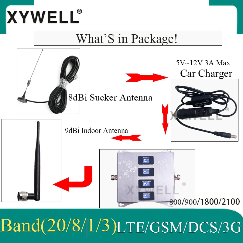 Этот усилитель подходит для Band20)LTE800MHZ GSM 900mhz DCS1800mhz WCDMA2100mhz частотный диапазон. Он может увеличить 2G 3G голосовые данные 4G. Если ваш сигнал 4G LTE 1800 (FDD band 3), этот повторитель также может увеличить данные 4g для вас. Пожалуйста, убедитесь, что вы можете получить по крайней мере 2 бар Band20)LTE 800 мгц 900 МГц (полоса 8)1800 МГц (полоса 3)WCDMA2100(FDD полоса 1) сигнал на открытом воздухе перед покупкой, В противном случае этот продукт не может вам помочь. Для улучшения сигнала в помещении необходим хороший внешний сигнал.