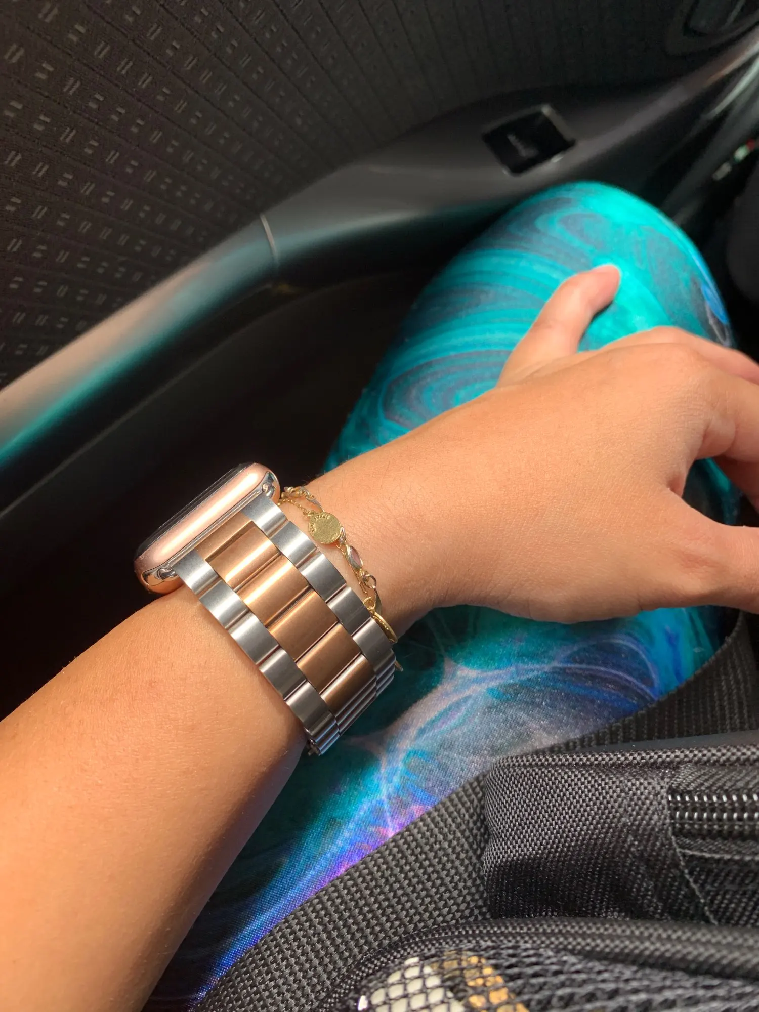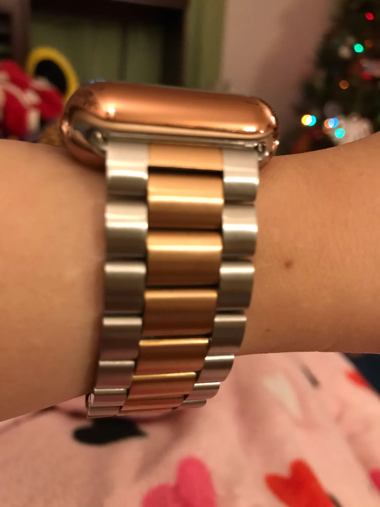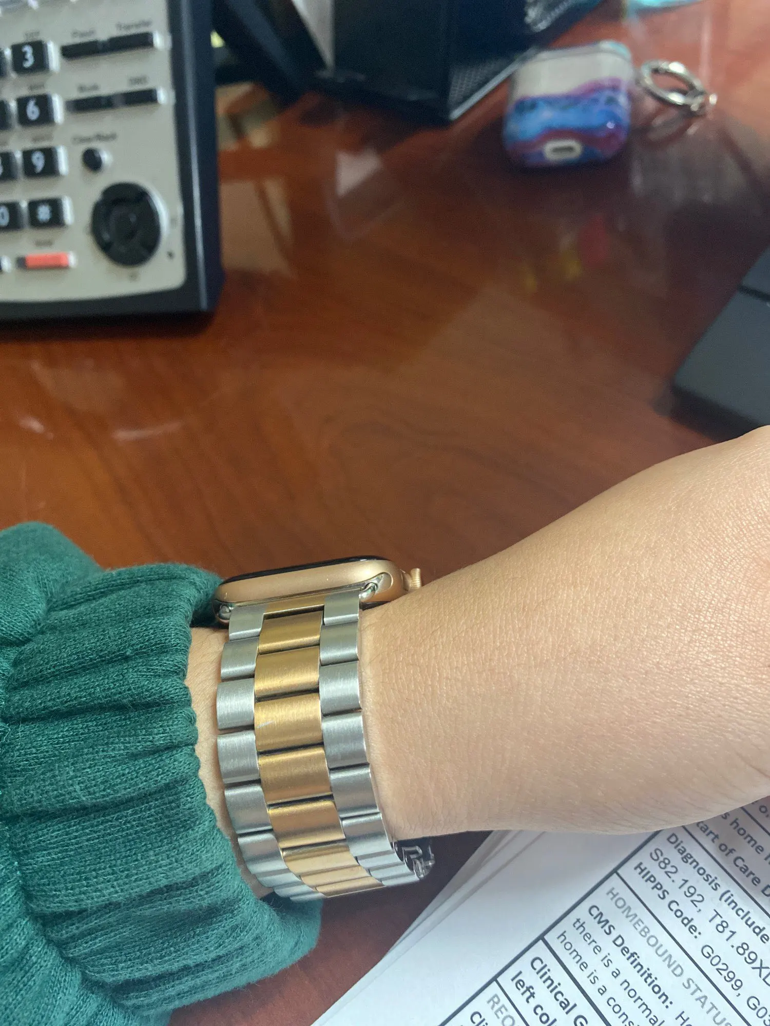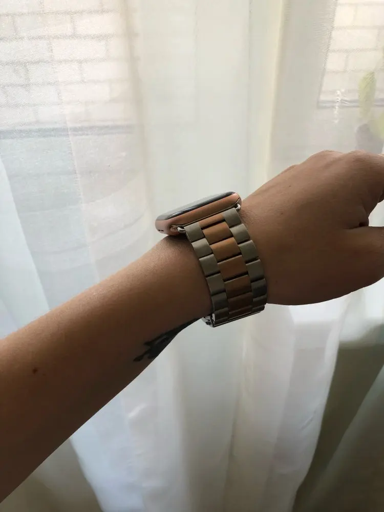 The rose gold color strap fits well with my aluminum gold watch. It’s a little bit more yellow, but I don’t mind. I’ve removed all of the adjustable links to fit my small wrist and it now fits. Feels very sturdy and is weighty. I’m happy with it. Time will tell if the color will fade or not.