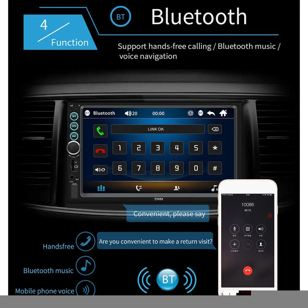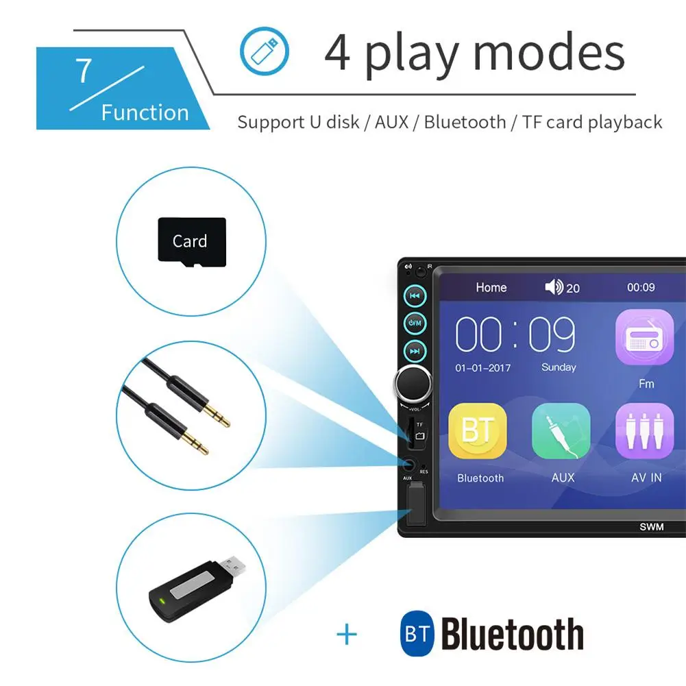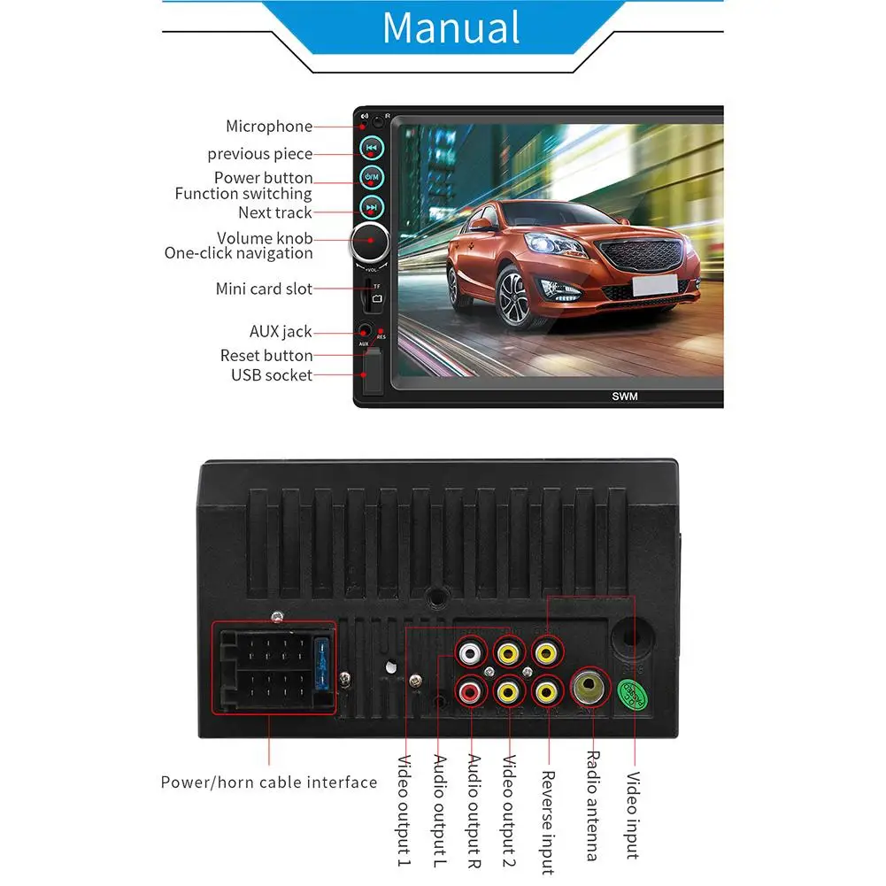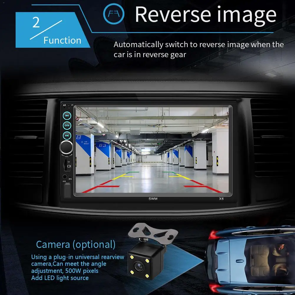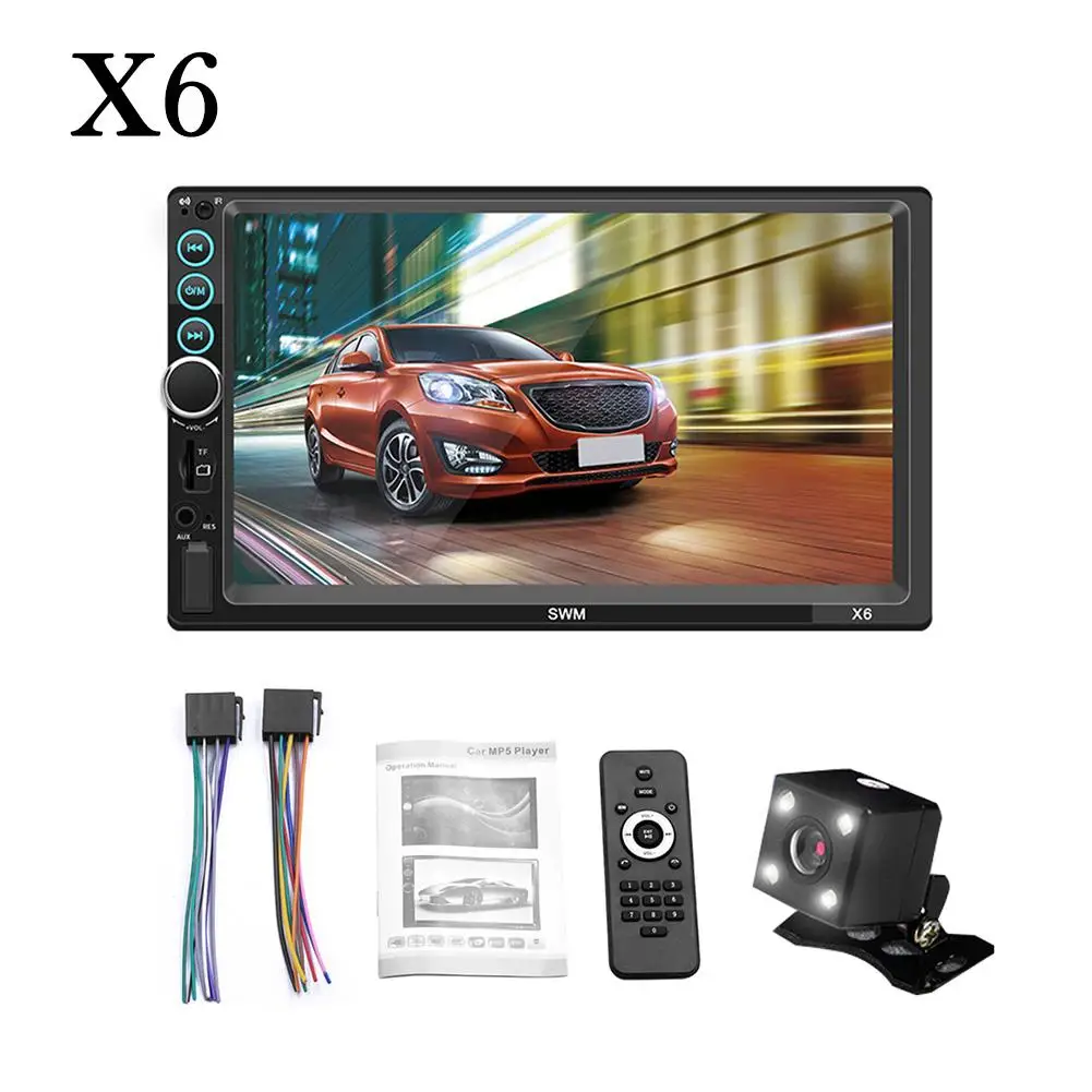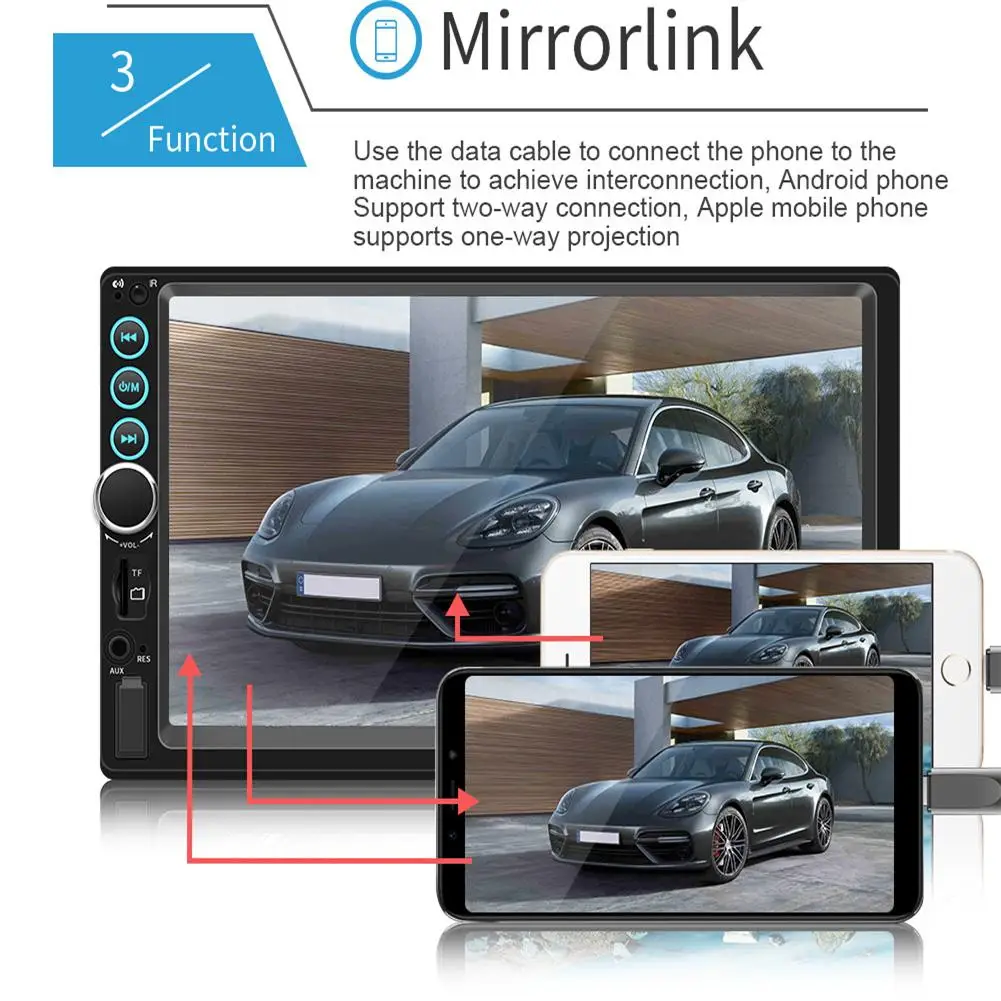 Особенности:Это связано с новейшим высокотехнологичным отражающим изображением. Вы можете подключить экран телефона (с поддержкой систем Android и iOS) к плееру через USB-кабель. Тогда вы можете коснуться плеера, чтобы управлять своим телефоном!1. 7-дюймовый 2 DIN HD Автомагнитола MP5 плеер с цифровым емкостным сенсорным экраном.2. Поддержка музыки по Bluetooth и громкой связи.3. Поддержка функции радио и встроенного дополнительного входа.4. Поддержка функции ввода камеры заднего вида.5. 24-часовой цифровой дисплей показывает часы и дату.6. Поддержка TF-карты (до 32 Гб) и стандартного USB-интерфейса.7. Поддерживает зарядку мобильный телефон или другие USB-устройства.8. Поддержка регулировки различных звуковых эффектов.9. Красочная подсветка кнопки питания украшена в вашем автомобиле.Характеристики Товара:Система: WIN-CEОсновные функции: MP5, интерфейс USB / TF, FM, Bluetooth, вход для камеры заднего вида, вход для обратной помощиРазмер экрана: 7 дюймовРазрешение экрана: 1024x600Язык меню: английский/китайский/испанский/португальский/русский/итальянский/немецкий/французский/Турецкий/Чешский/тайский/польскийФормат видео: RM/RMVB/AVI/MP4/MKV/3GPПоддержка аудиоформатов: MP3/WMA/WAV/APE/FLACФормат изображения: JPGВыходная мощность усилителя/количество каналов. : 60 Вт * 4Интерфейс: USB / TF / AUX INВходное напряжение: 12 ВВерсия Bluetooth: V4.0Пароль для сопряжения Bluetooth: «0000»Размер установки: около 180 мм * 102 мм (7,08 дюйма * 4,06 дюйма)Чип усилителя мощности: TDA7388Радиочастота: 87,5 ~ 108 МГцВидеовыход: ПоддержкаОбратное изображение: поддержка (соответствие камеры)Функция напоминания о тормозе: ПоддержкаУправление рулевым колесом: ПоддержкаУпаковочный лист:1 * мультимедийный плеер1 шнур питания1 * пульт дистанционного управления1 * Руководство пользователя1 * Камера заднего вида (опционально)Примечания:1. Автомобильный мультимедийный плеер совместим со всеми автомобилями. Пожалуйста, проверьте размер продукта.2. Мало известно об электронике, необходимой для установки. Пожалуйста, профессиональная помощь при установке.