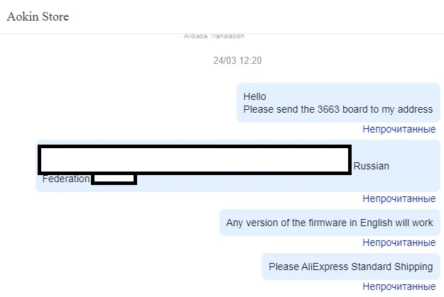 Оплатил покупку, получил трек доставки (СДЕК по РФ), но заказ мне не доставили Попросил отправить повторно, на что продавец сообщил что этих плат нет в наличии с русской прошивкой. Попросил с английской прошивкой, в ответ молчание Статус заказа необъяснимо поменялся на "доставлено", хотя подтверждения от меня не было Продавец не отвечает на мои сообщения в переписке, не отправил плату повторно, и не вернул деньги Вывод - ненадежный продавец, не дорожащий своей репутацией из-за наживы в 15 долларов. Будьте внимательнее при покупках в этом магазине.
