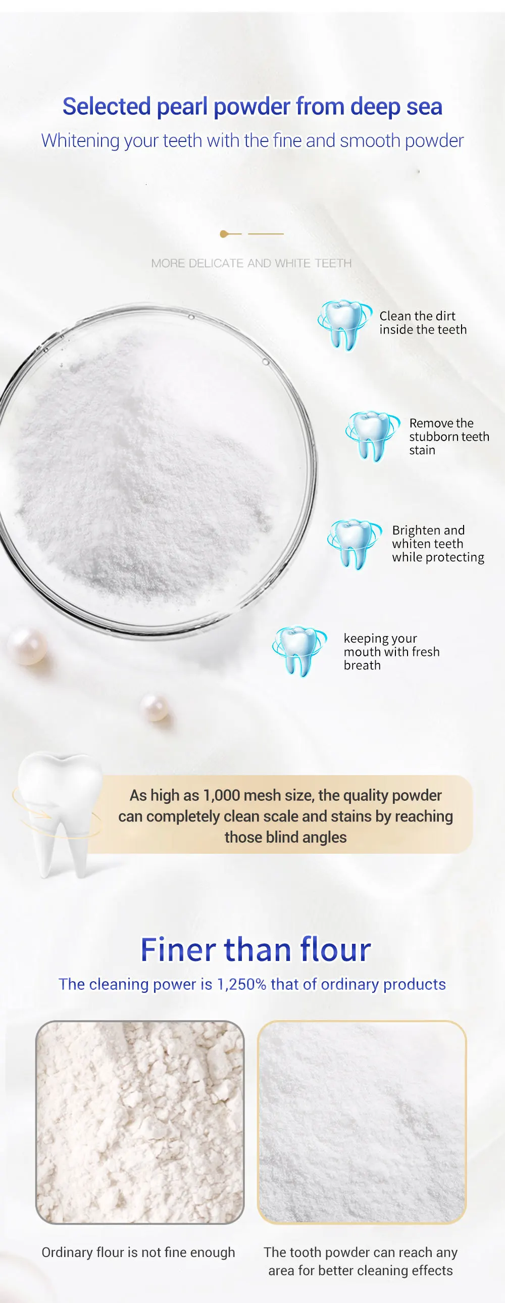 Отборная жемчужная пудра из глубокого моря Отбеливает зубы мелким и гладким порошком Очистите грязь внутри зубов Удалите стойкие пятна для зубов Скрасить и отбелить зубы во время защиты Свежее дыхание во рту До 1000 размер сетки, качественный порошок может полностью очистить масштаб и пятна, достигнув этих слепых углов Тоньше, чем мука Мощность очистки 1,250%, чем у обычных продуктов Обычная мука не является тонкой enoug Зубной порошок может достигать любой области для лучшего эффекта очистки