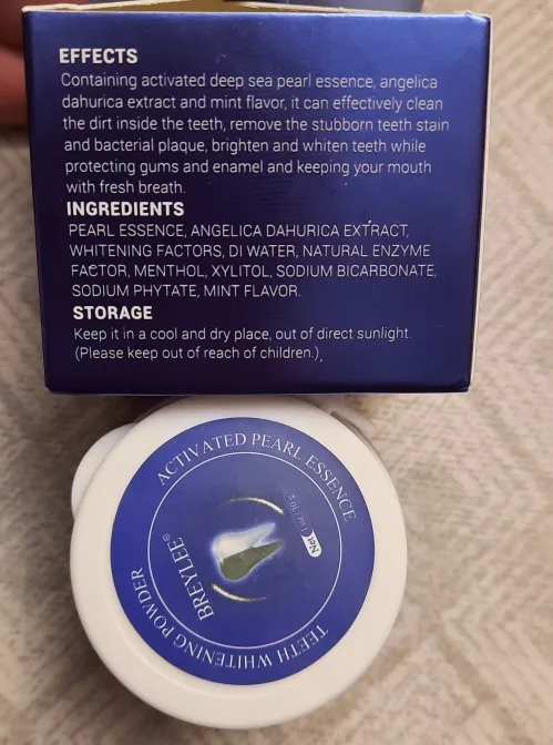 Название продукта: брейли Отбеливание зубов порошок Характеристики: 1 унций/30 г Эффекты: скрасить и отбелить зубы, защищая десны и эмаль и сохраняя рот свежим дыханием. Состав: перламутровая эссенция, экстракт Анжелики дахура, отбеливающие факторы, вода Di, натуральный ферментный фактор, ментол, ксилит, Мятный вкус. Срок годности: 3 года Внимание: только для наружного использования. При возникновении дискомфорта немедленно прекратите использование. Хранить в недоступном для детей месте. Наслаждайтесь кофе Не нужно беспокоиться о желтых зубах, даже если вы пьете больше кофе