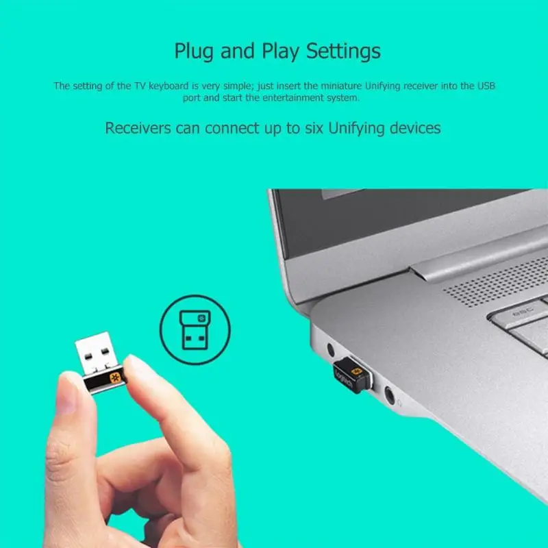 -Настройка клавиатуры телевизора очень проста. Просто подключите микроприёмник к usb-порту и начните развлекательную систему. Приемник может подключать до шести устройств Uniflying. Срок службы батареи составляет до 18 месяцев, что устраняет частые проблемы с заменой батареи, что дополнительно продлевает срок службы батареи с помощью включения/выключения;