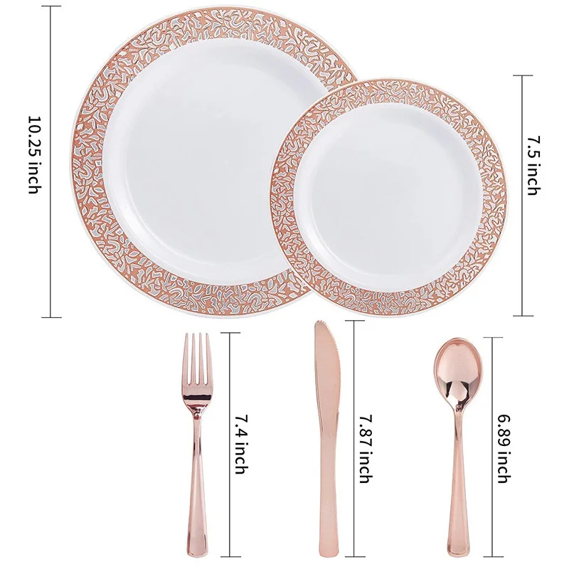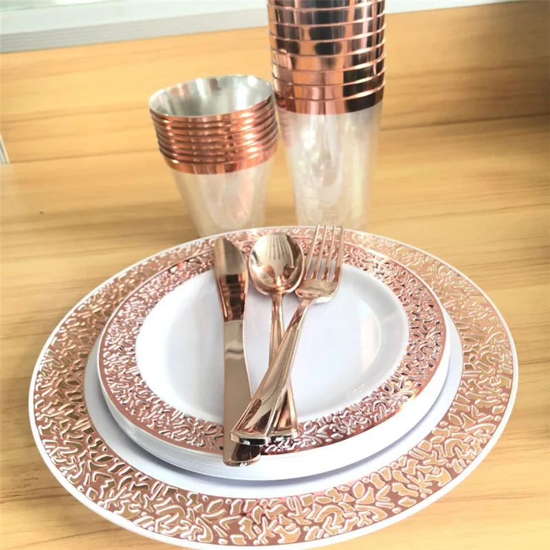 25 шт. одноразовые пластиковые вилки для посуды цвета розового золота Ножи Ложки пробы кружевные дизайнерские тарелки для свадебной вечеринки набор золотой посуды товары для вечеринок