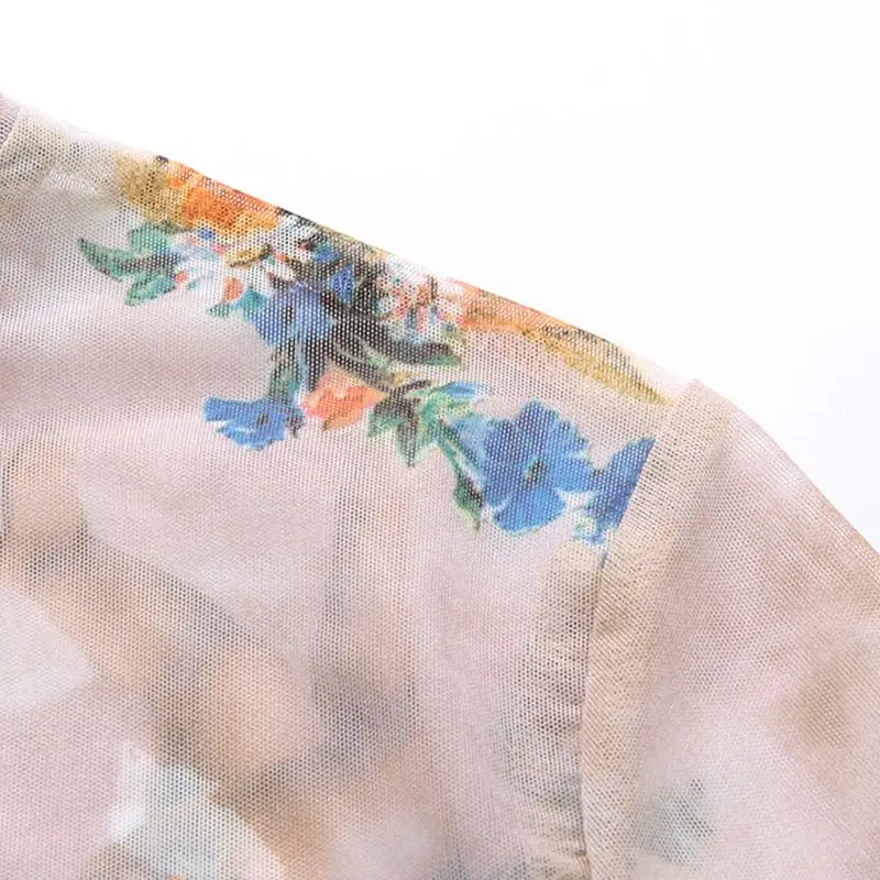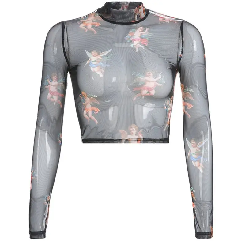 Женский летний укороченный топ с длинными рукавами и ложным воротником, романтичная цветная футболка с принтом ангела и Купидона, прозрачная сетчатая вечерняя Клубная 4