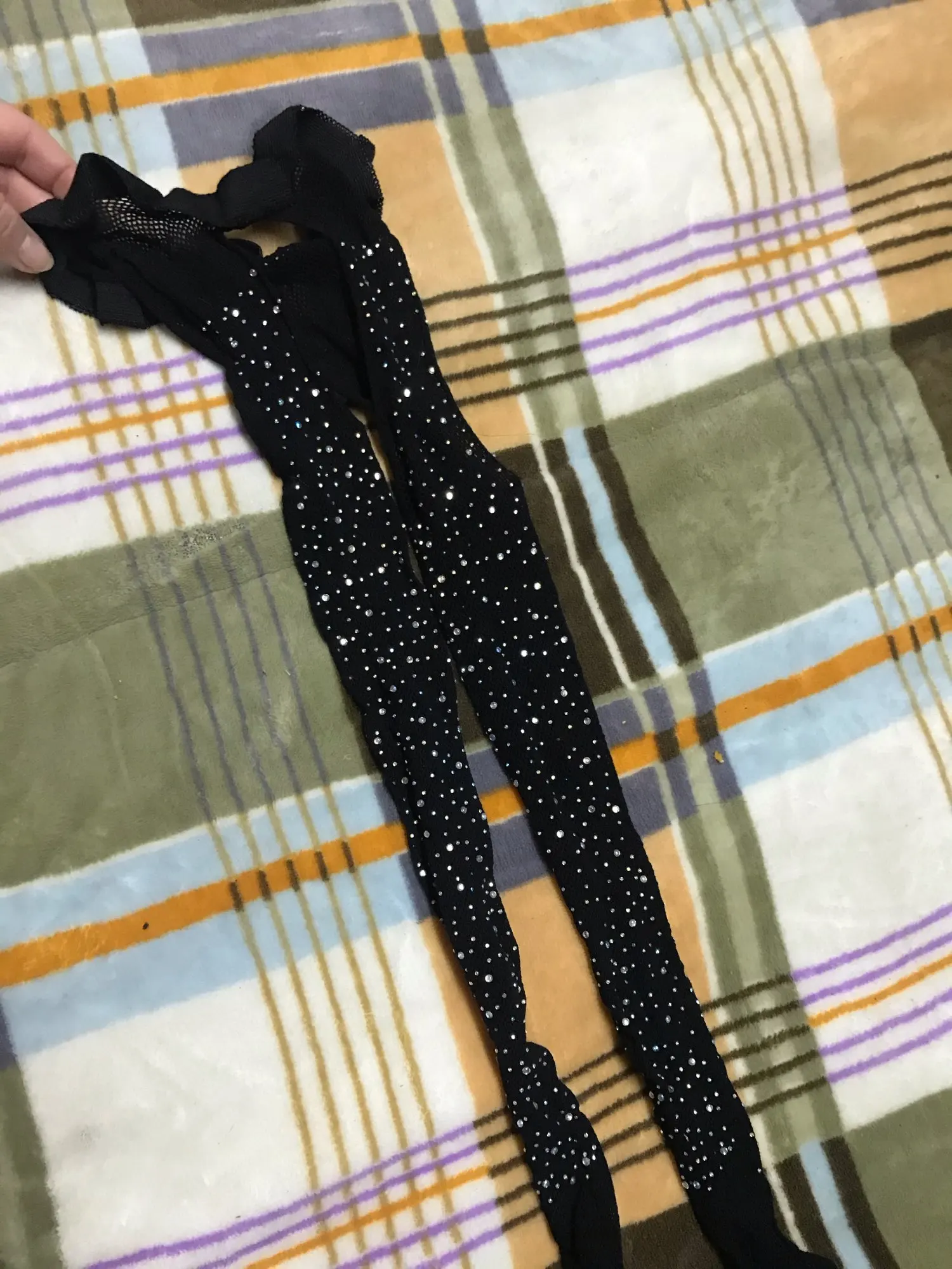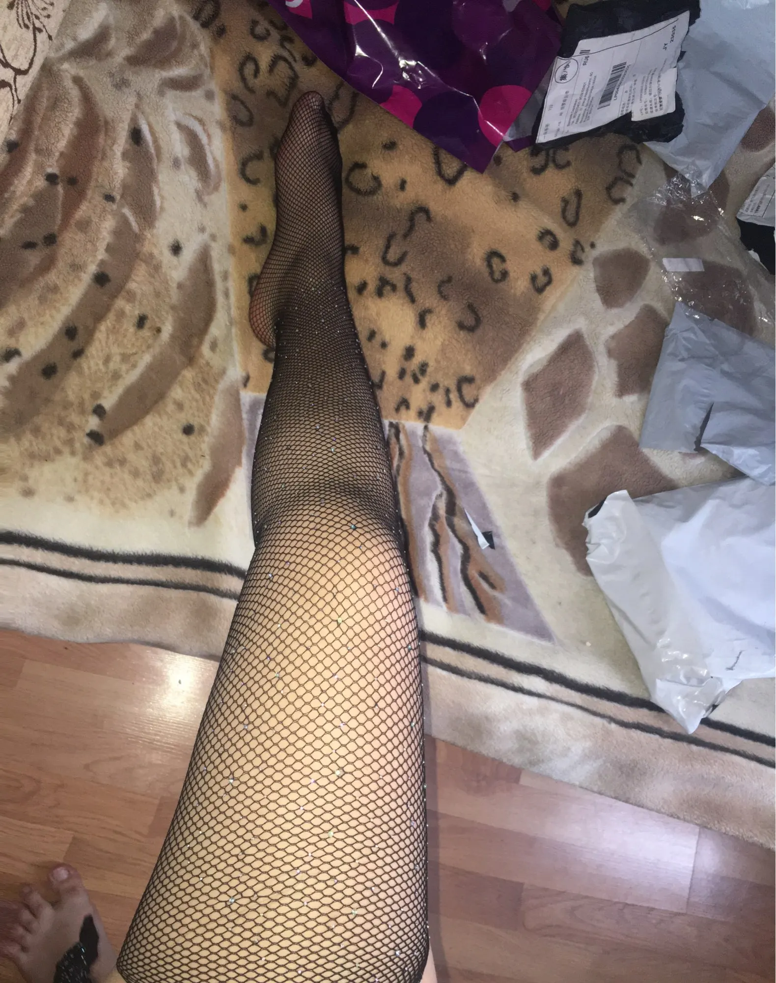 колготки пришли хорошо упакованные, целые, все стразы на месте. Очень обрадовалась. Примерила и разочаровалась, что мне попалась бракованная пара. На одной колготине стразы начинаются со щиколотки, на другой - с голени. Очень расстроилась, так как в целом мне товар очень понравился. Если сдвигать место без страз ниже, то мне мало по росту((. Провела спор, вернули половину стоимости.Если это единственный случай брака, то продавца рекомендую. А товар отличный, для яркого образа.
