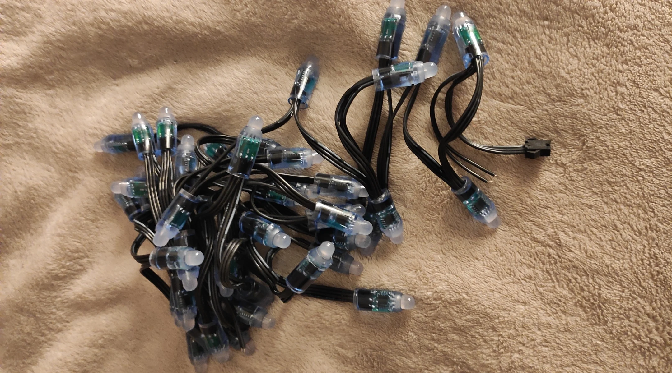 Отличная адресная лента, 50 диодов, с каждой стороны по разъему (мама, папа) и по 2 провода для дополнительного питания. Для подключения подходят разъемы JST SM 3P.