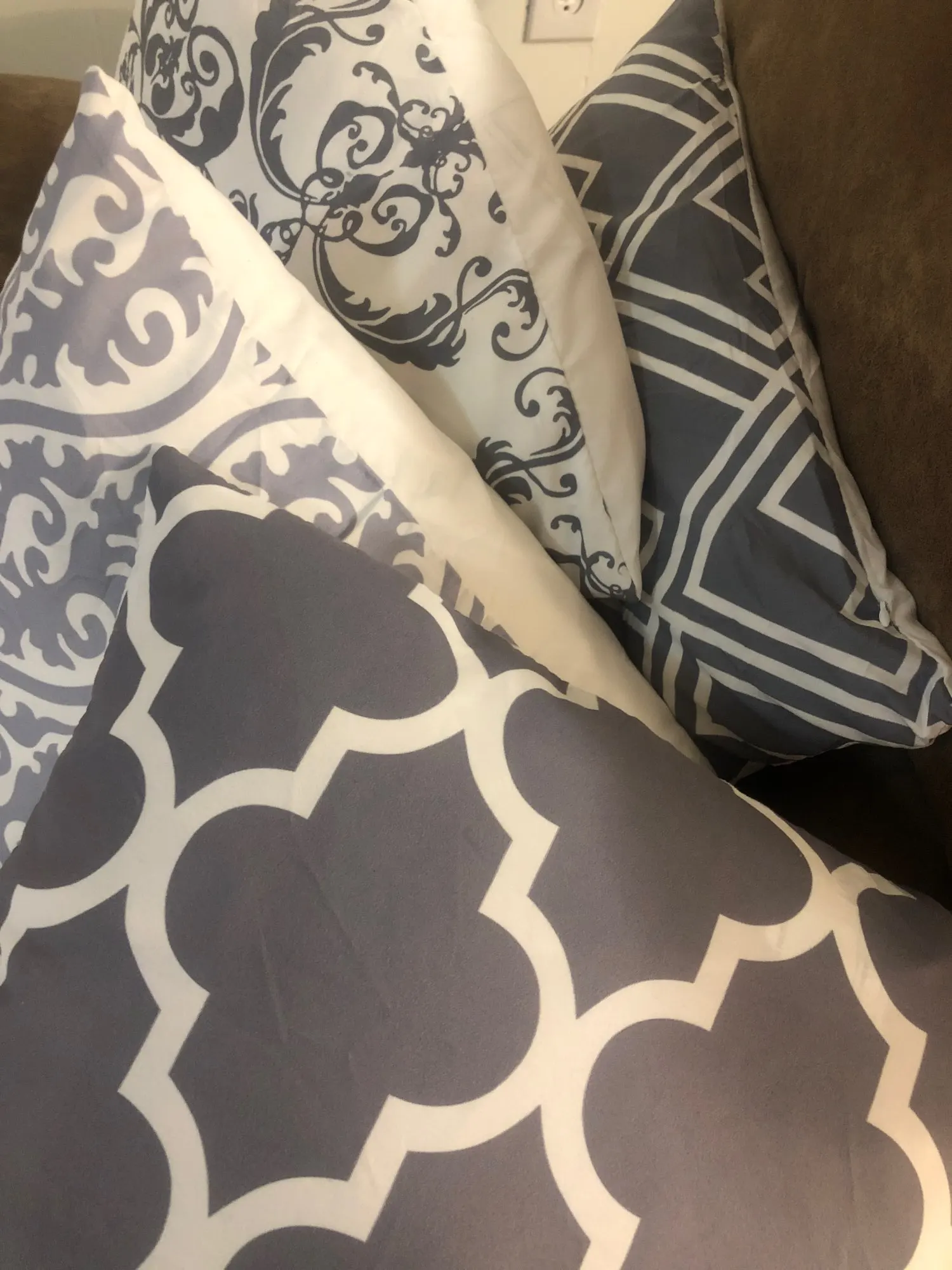 Идеально, как указано, размеры 45 см на 45 см, передняя часть серая с узорами, белая задница