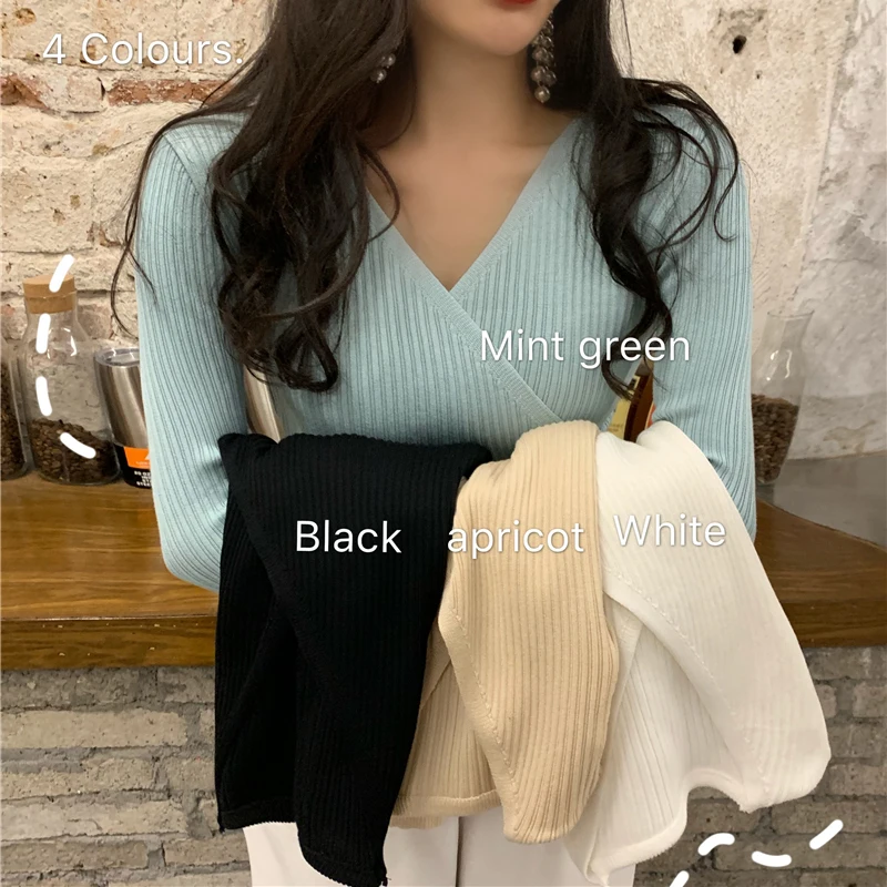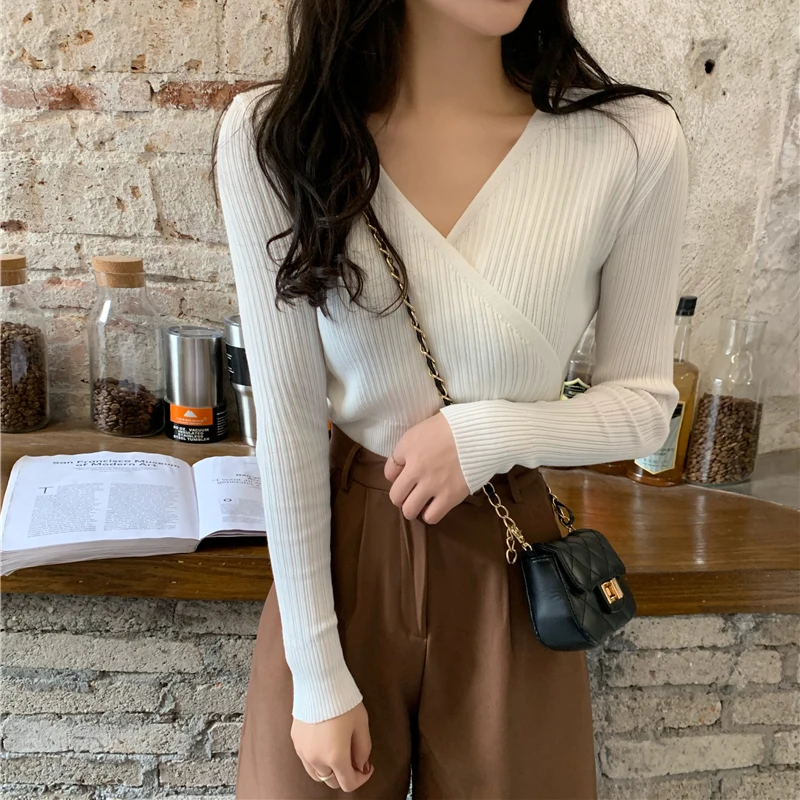 Осень-зима 2019, простой Женский пуловер Mozuleva с V-образным вырезом, с перекрещивающимися швами, тонкий женский вязаный свитер, топы, джемперы с длинными рукавами