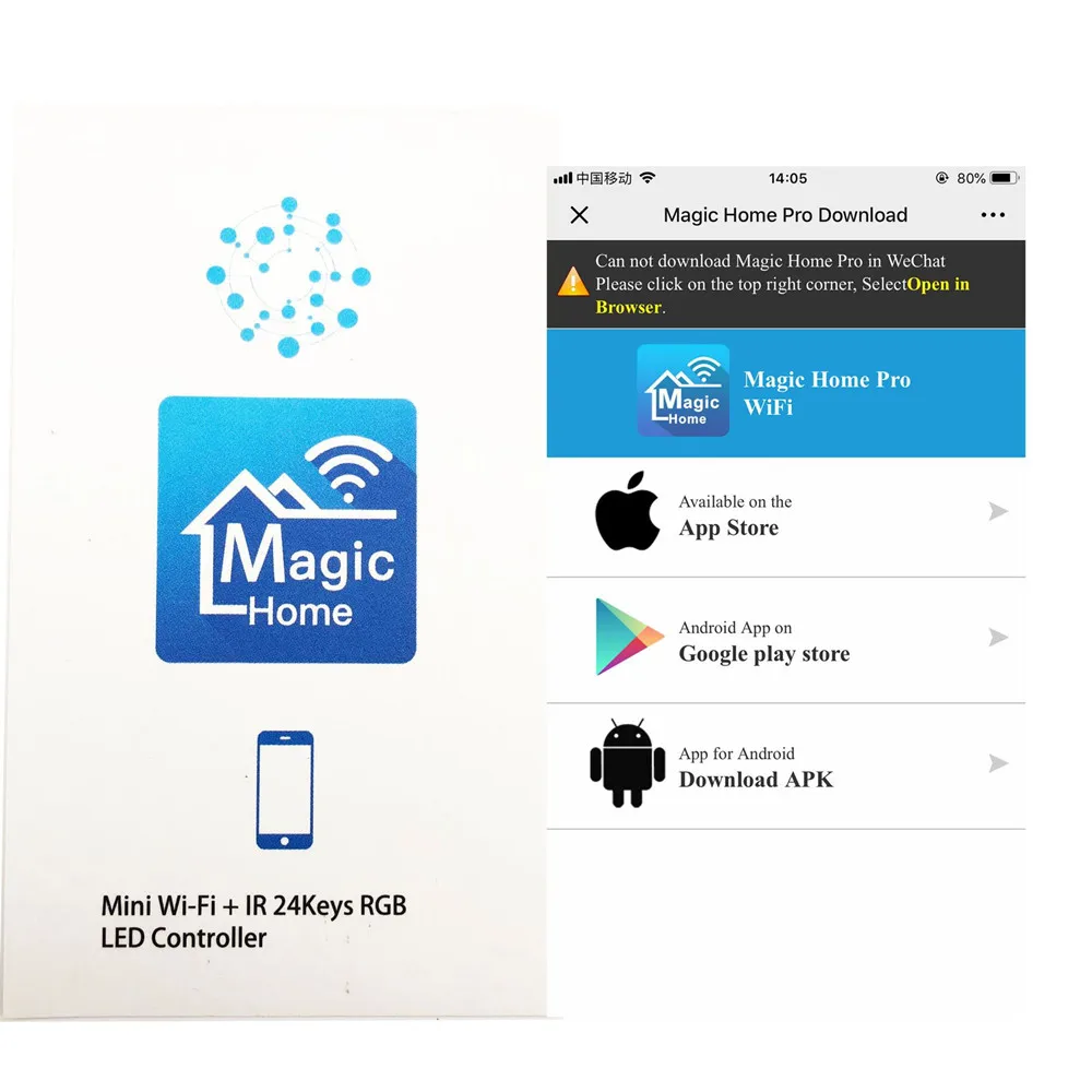 Подпишитесь на нас, чтобы насладиться эксклюзивной скидкой для фанатов 1. Цена VIP и дополнительная скидка для подписчиков 2. Выигрыш бесплатных продуктов и больших купонов от магазина клуба 3. Заранее зная о новых поступлениях, продвижении магазина и других преимуществах. Параметры продукта И. Особенности: 1. Управление через мобильное приложение Wi-Fi, большое расстояние дистанционного управления, гуманная работа: 2. Поддержка общего светодиода RGB на рынке: 3. Яркость регулируется, последовательность каналов RGB регулируется, встроены различные эффекты рисунка. 4. Широкий входной ток 5-28 В постоянного тока; 5. Функция сохранения параметров при выключенном питании: Мобильное приложение: · Контроллер управляется мобильным приложением и поддерживает системы IOS и Android: · Вы можете найти «Magic home» в APP Store или Google Play или отсканировать соответствующий QR-код для загрузки и установки: Технические параметры: Рабочая температура: -20 ℃ ~ 60 ℃; Рабочее напряжение: 5 В ~ 28 В постоянного тока; Рабочий ток: 20 мА ~ 40 мА; Расстояние дистанционного управления: 15-20 м;