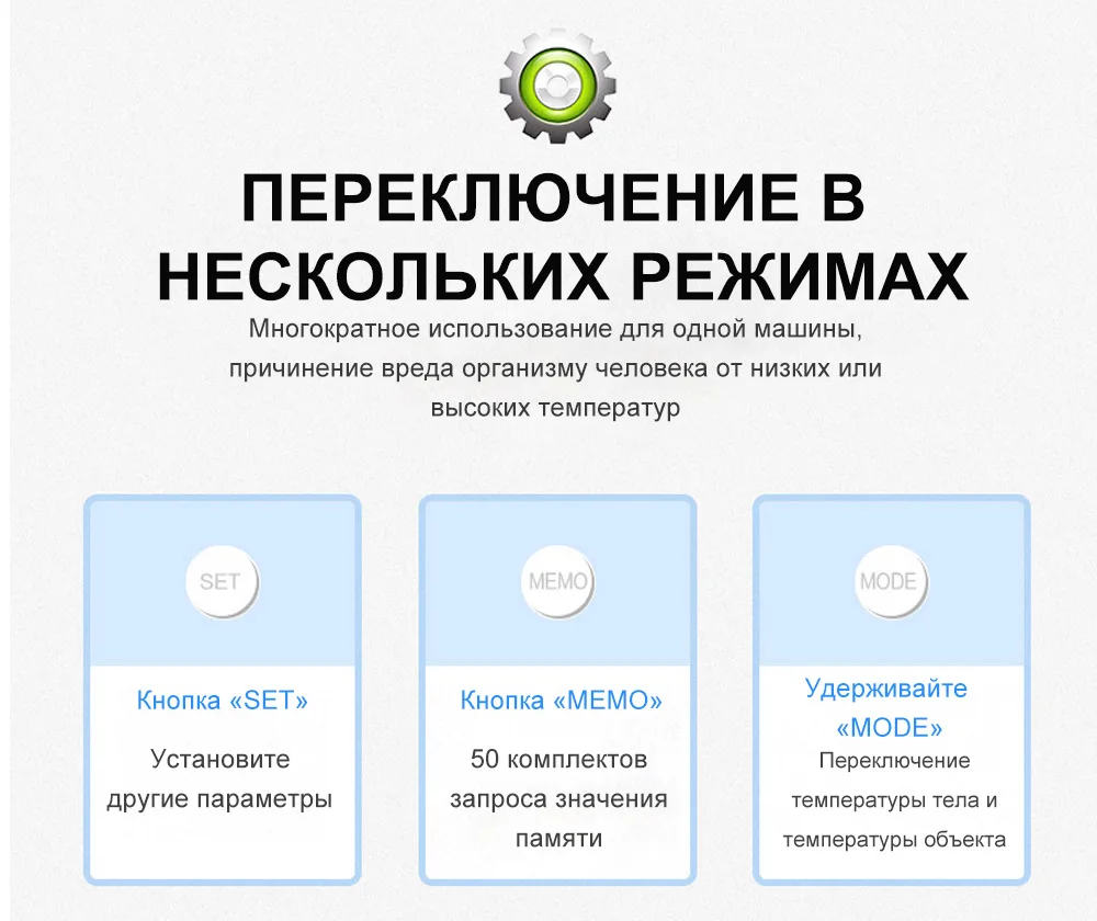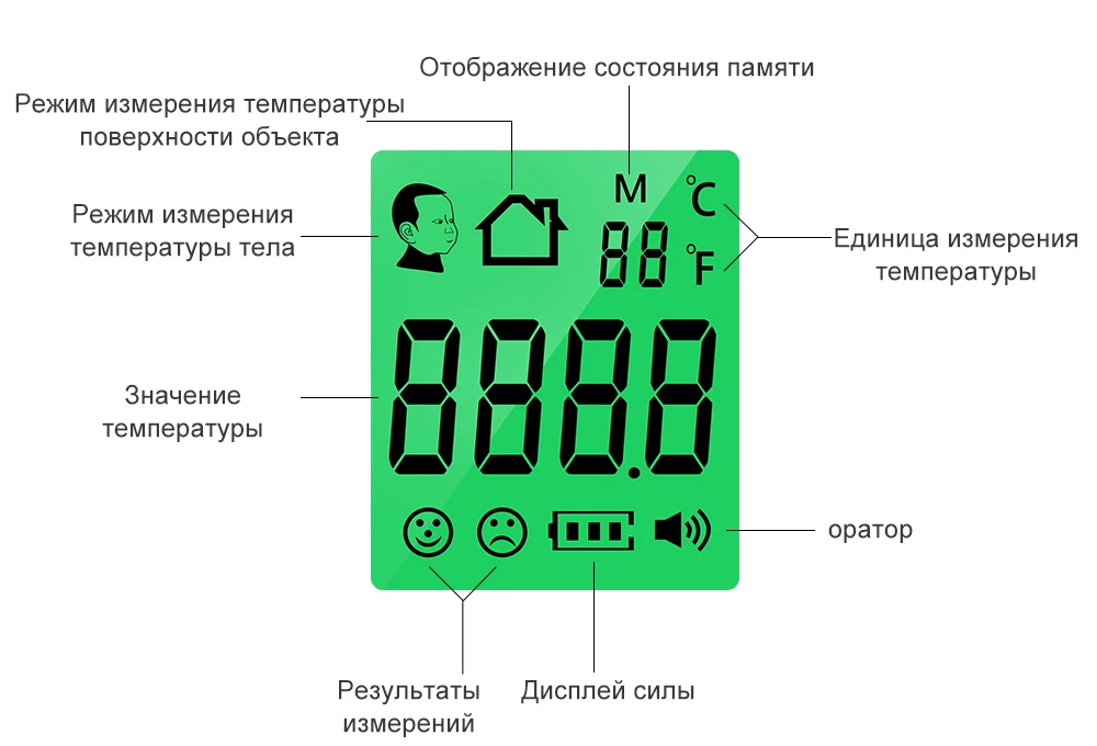 Шаг 1: положите в батарею (советы: Не устанавливайте неправильно). Шаг 2: от лба 1-3 см, нажмите клавишу измерения, экран покажет температуру тела. Шаг 3: кнопка «режим» может переключить температуру тела и температуру объекта. Примечания: если температура низкая, экран покажет «LO», если температура слишком высокая, экран покажет «Hi».