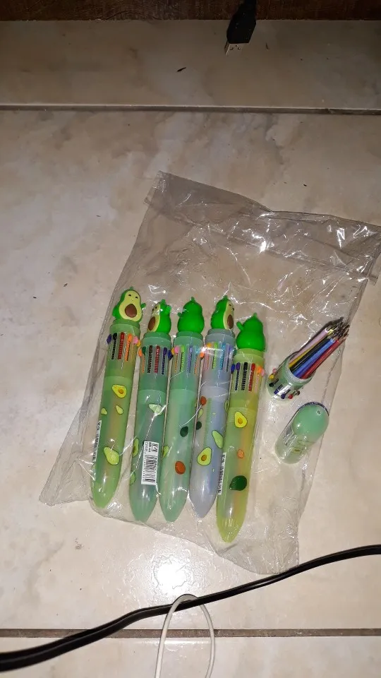 хорошая ручка, но к нам пришла с трещиной. пользоваться можно, но неприятно. чтобы отщелкнуть стержень надо нажать на авокадо или повернуть его влево-вправо. цвета все пишут. в Москву посылка шла 2 мес.