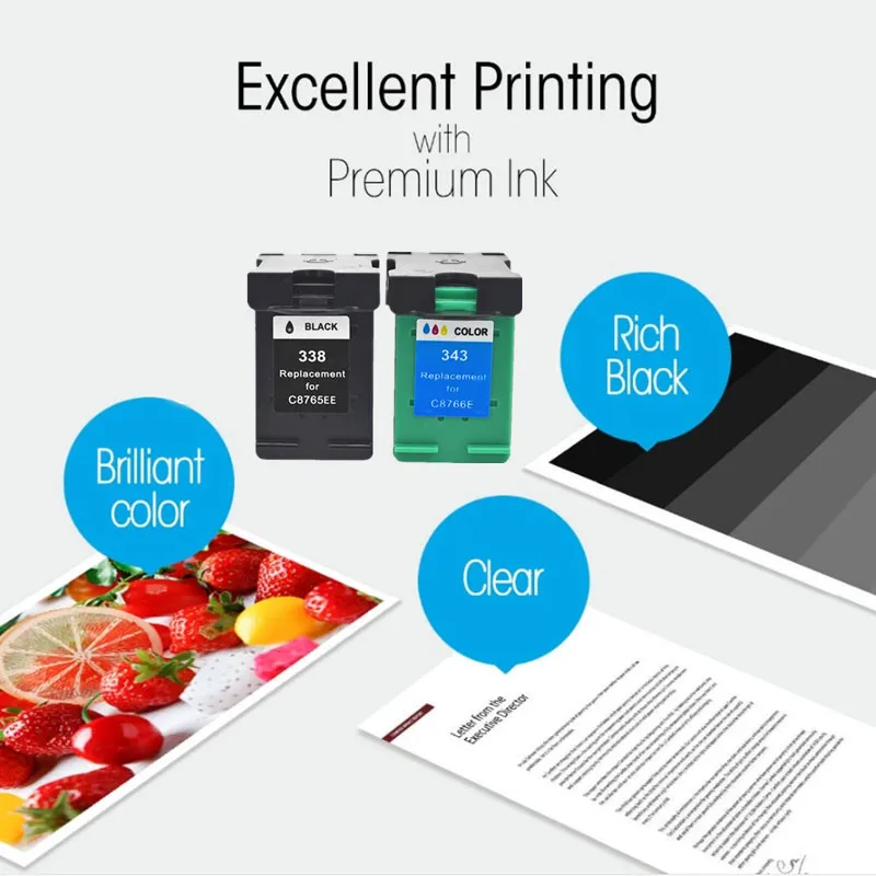 Модель: чернильный картридж для HP 338 343Код картриджа: C8765EE и C8765EEОсобенность: ВосстановленныйОбъем: Bk-18ml, Tri-color-18mlЦвет картриджа: черный и трехцветный (C/M/Y)Выход страницы: Bk 600 страниц, трехцветные 450 страниц (формат A4, покрытие 5%)Совместимый принтер:Для принтеров HP Deskjet 5740 6520 6540 6840.Для принтера HP Photosmart 8150.Если ваш оригинальный чернильный картридж 338 343, наш картридж подходит для вашего принтера.