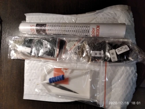 упаковано хорошо,холст намотан на валик,без заломов. стразы в зип- пакетах,количество цветов совпадает с таблицей, НО РАЗМЕР КАРТИНЫ 39*48,5!!!! рамка 40*50 не подходит,подарка не получилось.обидно.