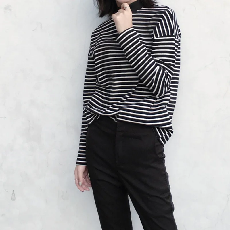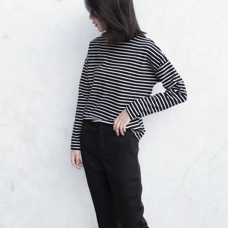 Футболка женская в полоску, базовый эластичный Топ с высоким воротником и длинным рукавом, базовая нательная рубашка с заниженными плечами, идеальный пуловер