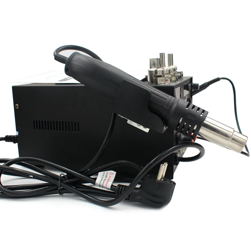 Технические параметрыМашина:Номинальная Напряжение: от сети переменного тока: 220V ± 10% 50 ГцВ общей сложности Мощность: 700 Вт + 50 Вт + 15 Вт = 765W ± 10% (макс.)Рабочая зона: 0-50 °CТемпература хранения: -20-80 ° c Железные элементы обернутыВыходное напряжение: переменный ток: 26V ± 10%Выход Мощность: 50 Вт ± 10%Диапазон температур: 200 -480 °CТемпературная Устойчивость: ± 2 °CКончик на сопротивление заземлению <2 ОмНапряжение от кончика до заземления <2 мВ Детали пистолета горячего воздуха:Рабочее напряжение: AC: 220V ± 10% 50 ГцВыход Мощность: 700W ± 10%Диапазон температур: 100 -480 °CТемпературная Устойчивость: ± 2 °C