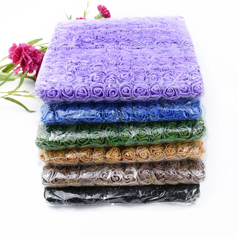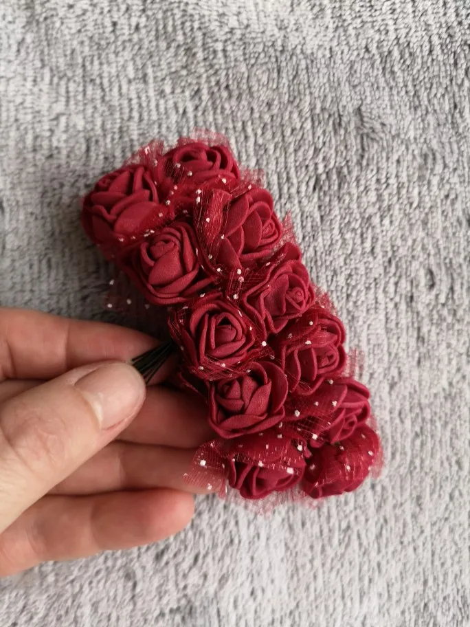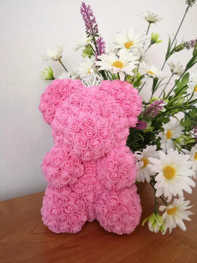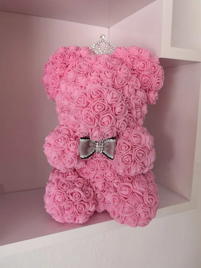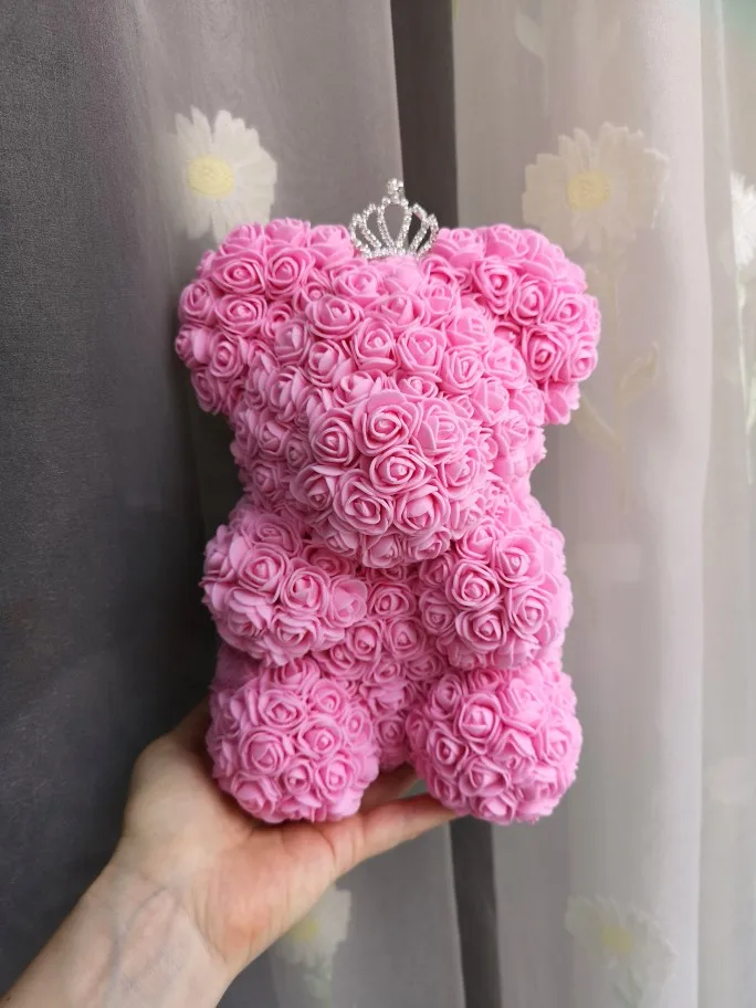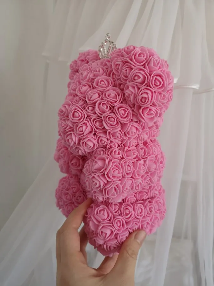 Розы Супер! Цвета насыщенные, яркие. Фоамиран, из которого изготовлены розы, плотненький, крепкий, держит форму. Розы с сеточкой. Из минуса - розы немного воняют табачным дымом. Брала по 5 упаковок роз розового и бордового цвета по 144 шт в каждой. На медведя высотой 20 см пошло 3 упаковки роз + 30 штучек из 4-й упаковки. На фото медведь из роз без сеточки. Продавца и товар рекомендую.