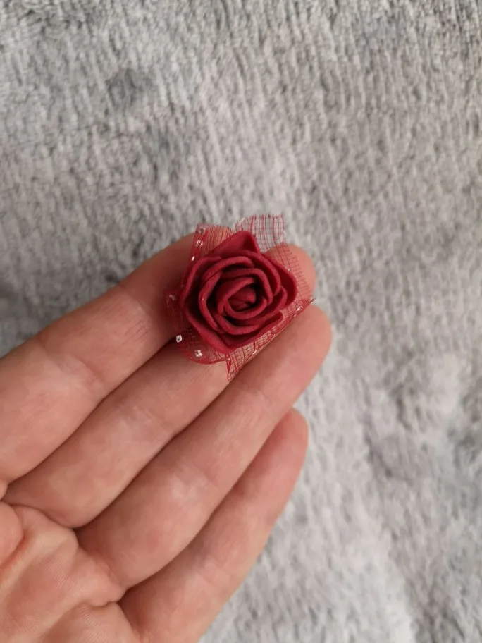 Розы Супер! Цвета насыщенные, яркие. Фоамиран, из которого изготовлены розы, плотненький, крепкий, держит форму. Розы с сеточкой. Из минуса - розы немного воняют табачным дымом. Брала по 5 упаковок роз розового и бордового цвета по 144 шт в каждой упаковке. На медведя высотой 20 см пошло 3 упаковки роз + 30 штучек из 4-й упаковки. На фото медведь из розочек без сетки. Продавца и товар рекомендую.