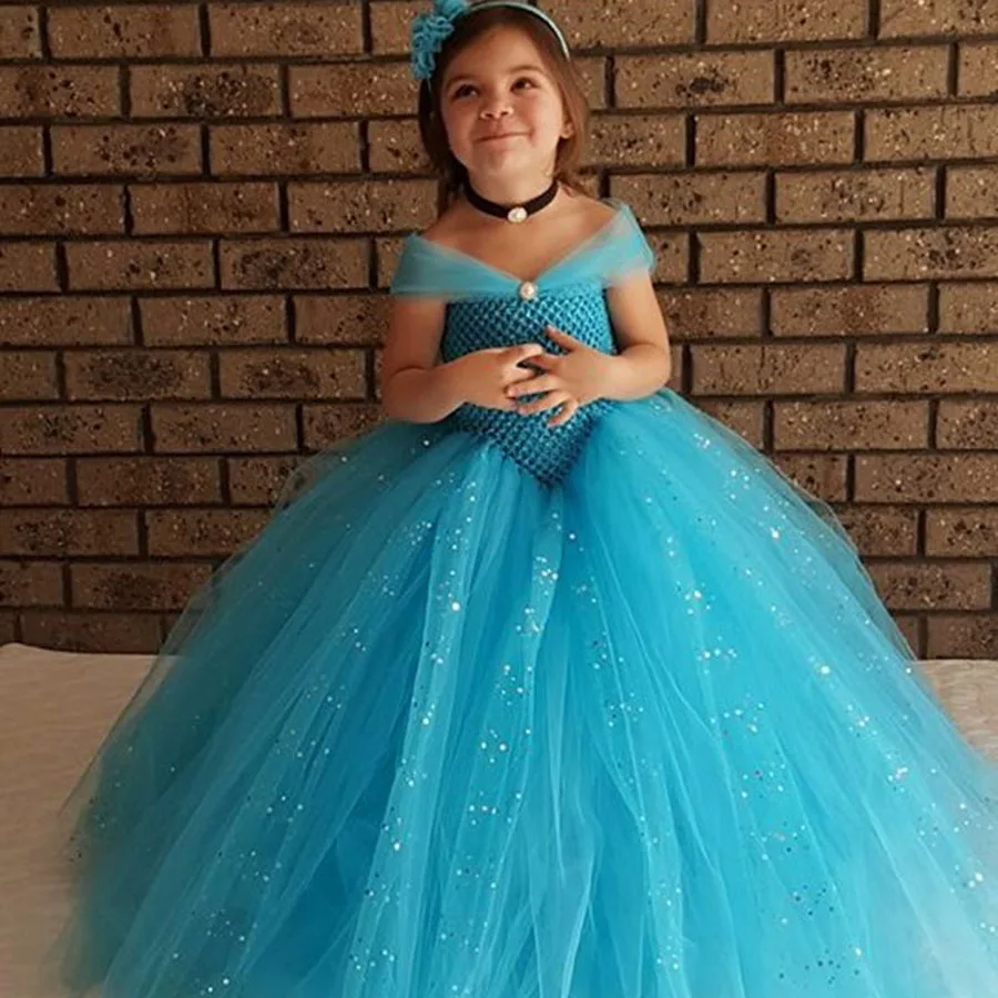 Синее блестящее платье-пачка принцессы для маленьких девочек детское вязаное платье Эльзы из тюля бальное платье с бантом для дня рождения