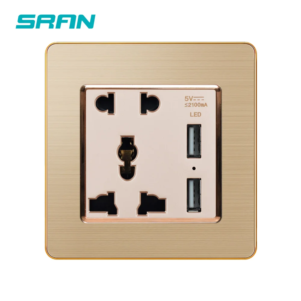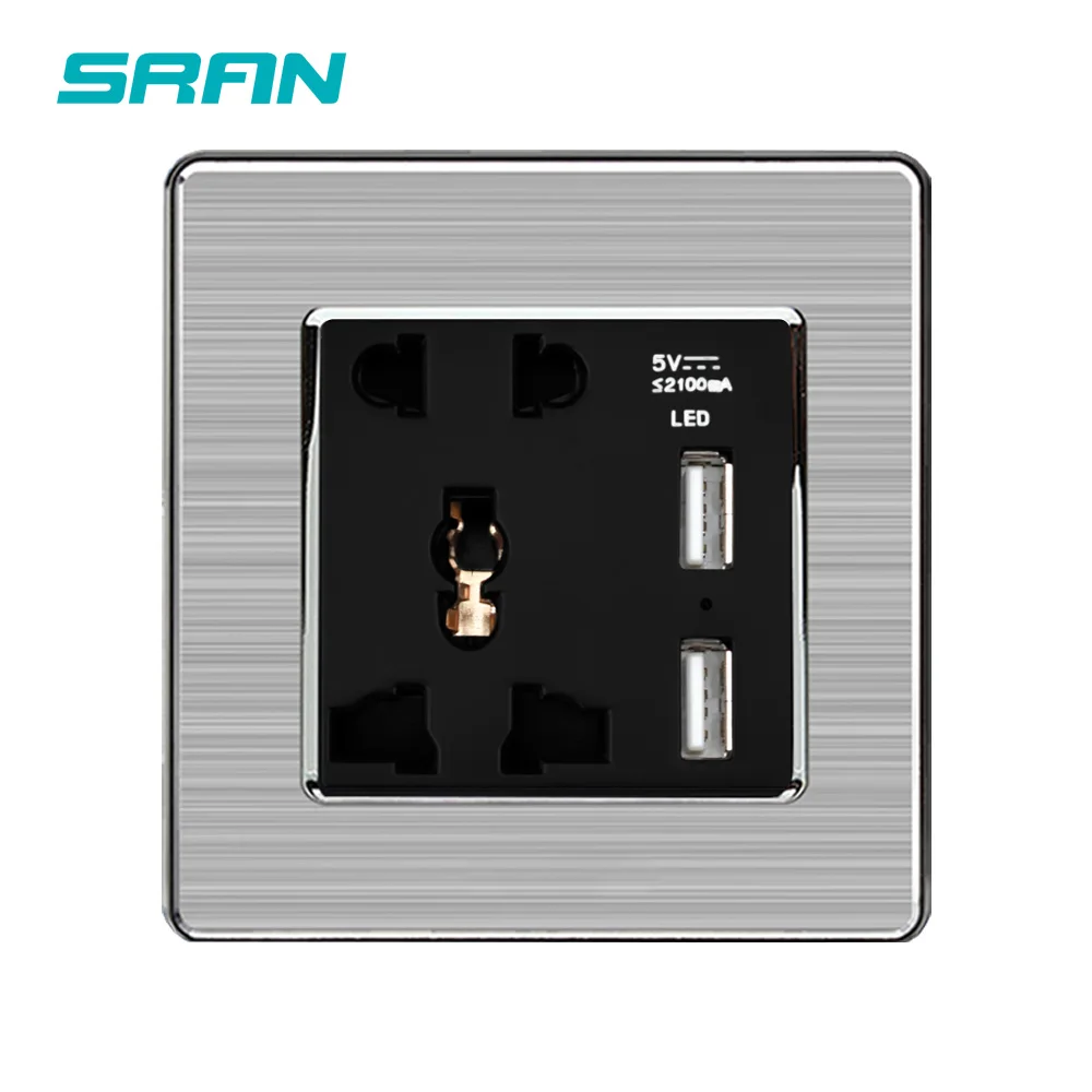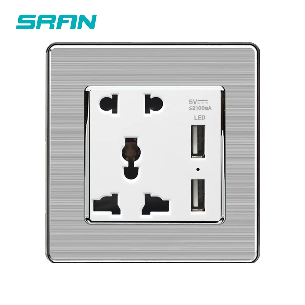 SRAN 5 pin Универсальное гнездо питания, гнездо с usb, двойной usb 5v 2A LED умный Поворотный Светильник панель из нержавеющей стали 86 мм * 86 мм