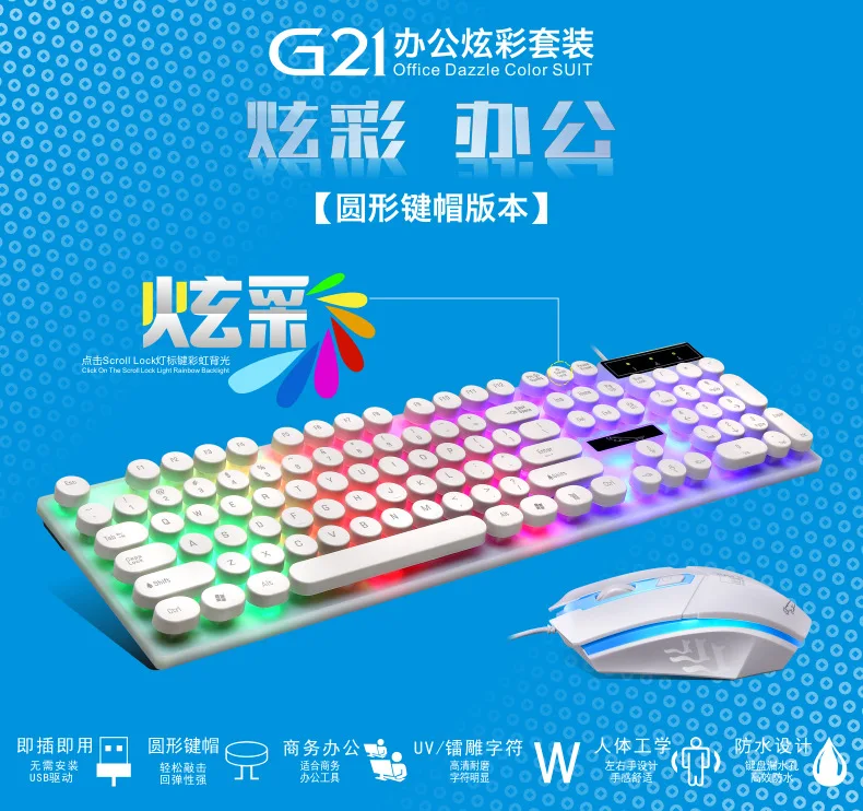 Комплект клавиатуры и мыши Cloudro G21, светодиодный, с радужной Цветной подсветкой, игровой, USB, проводная клавиатура, набор мыши с 104 клавишами (черный/белый)