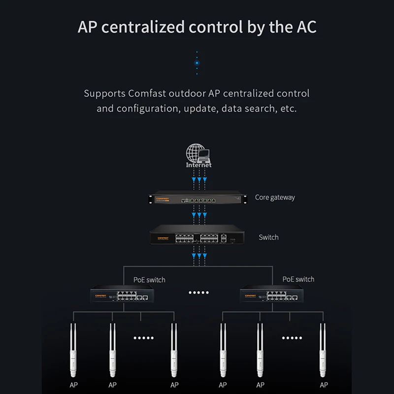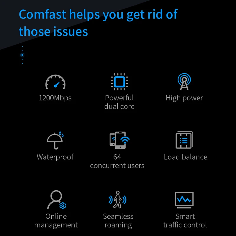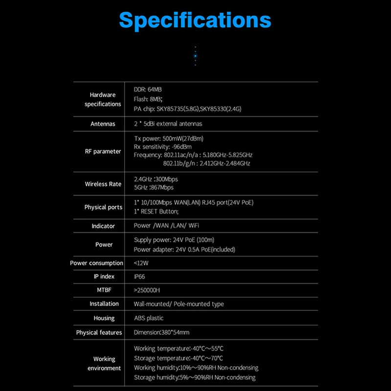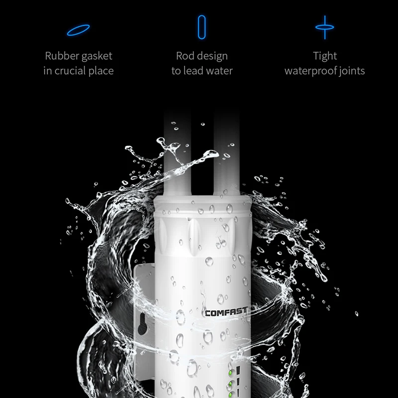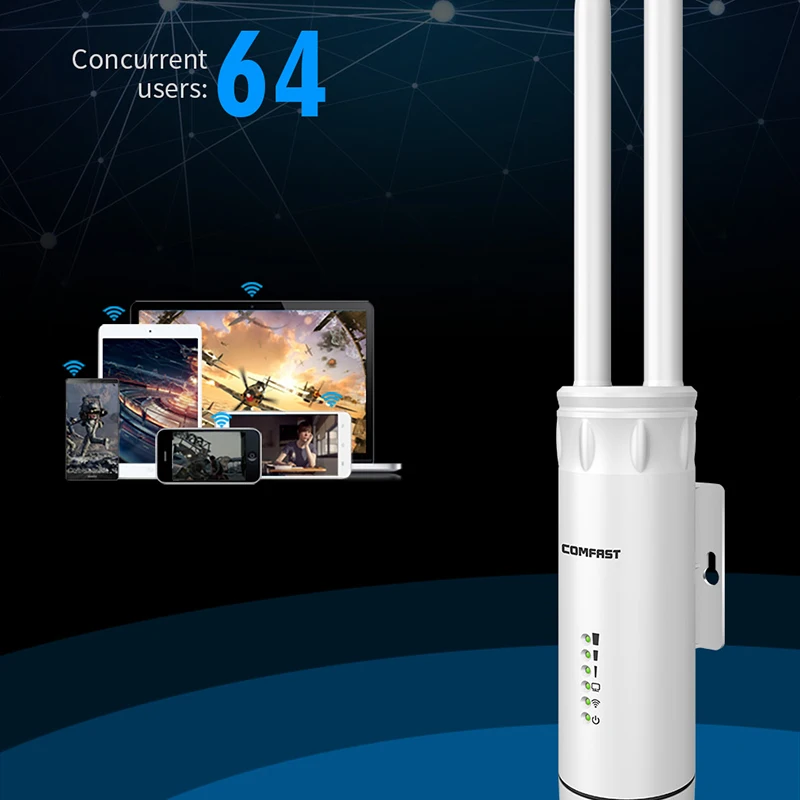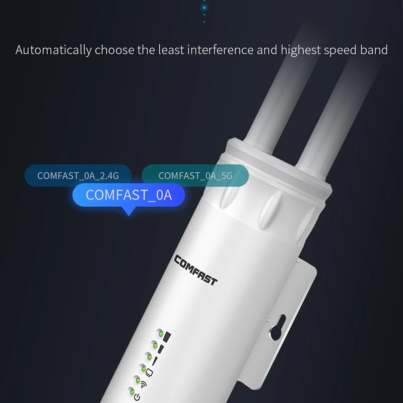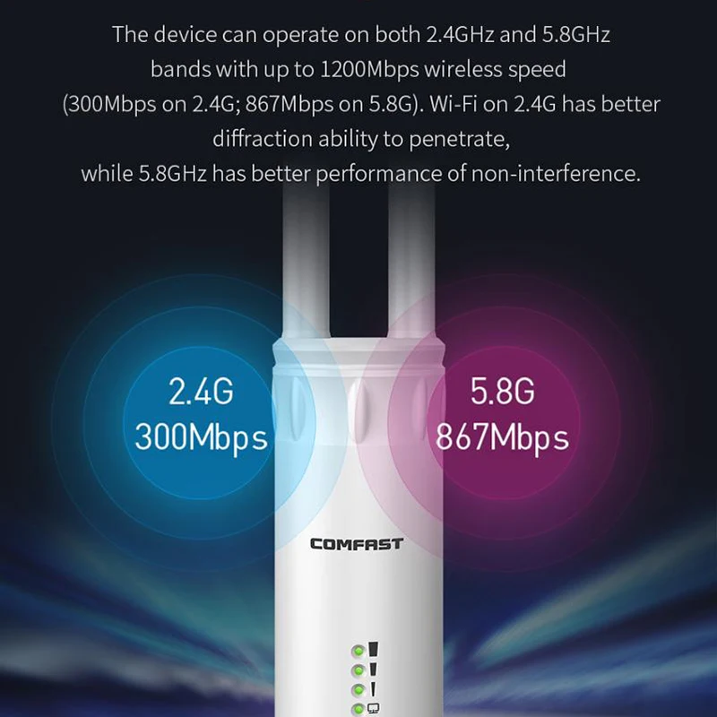 Высокомощный Wi-Fi AP/Repeater AC1200 в основном используется для обеспечения бесплатного Wi-Fi обслуживания в больших областях, таких как фабрика, сообщество, улица и т. Д. AP/ретранслятор сигнала может принять существующий 2,4 ГГц Wi-Fi 5 ГГц беспроводной сигнал, повторите и продления сроков поставки для большего диапазона, где это слишком далеко для роутер или точка доступа, чтобы доставить. AP/Repeater одновременно поддерживает Беспроводное сетевое соединение 2,4G и 5G, а также поддерживает скорость передачи данных 2,4 и 5G до 1200 Мбит/с. Он имеет 2 внешних антенны, обеспечивающие еще лучшую беспроводную производительность, скорость передачи, технологию стабильности, которая автоматически позволяет избежать коллизии каналов с помощью функции выбора канала.