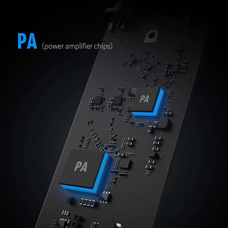 PA (усилитель мощности-сторонние микросхемы) используются как на 2,4 ГГц и 5,8 ГГц полосы для того, чтобы улучшить Tx/Rx способность, что делает ее очень хорошо подходит для большой открытый зона покрытия Wi-Fi.