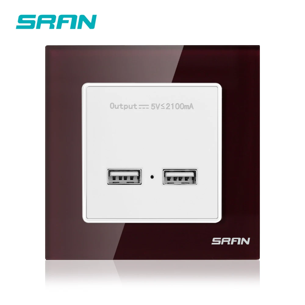 Настенная розетка SRAN с двумя USB-портами для зарядки мобильных телефонов 5 В, выход 2,1 А, панель из закаленного стекла с кристаллом