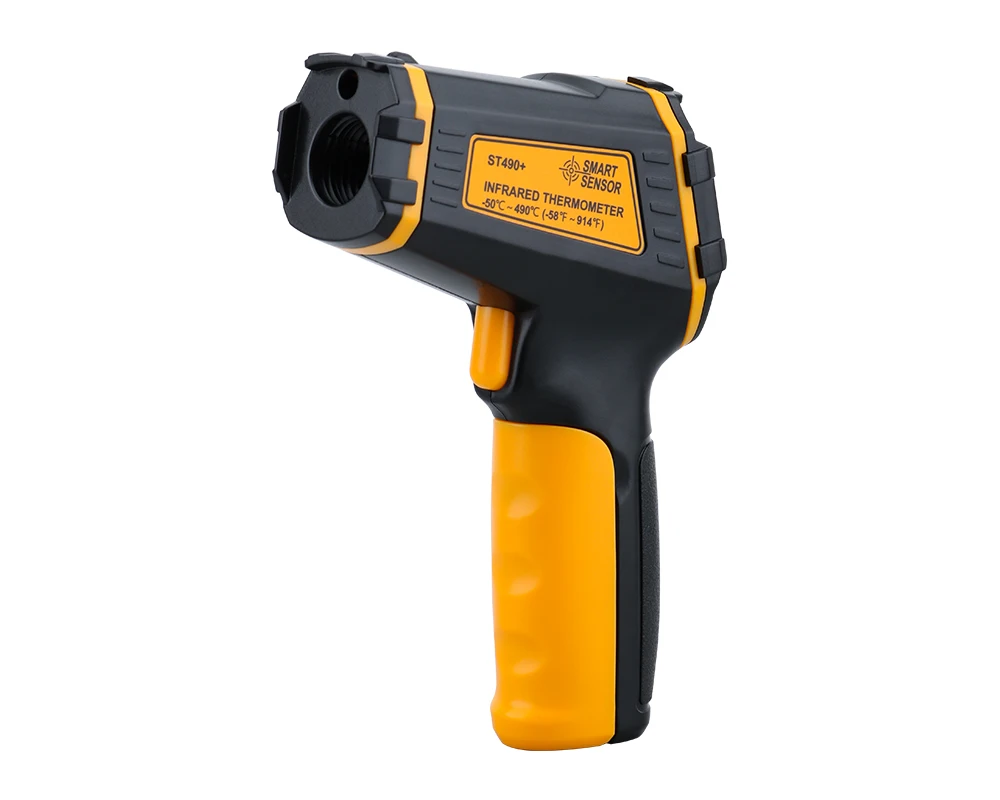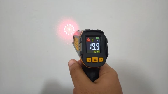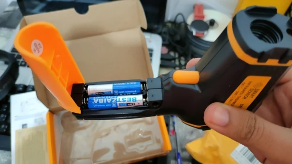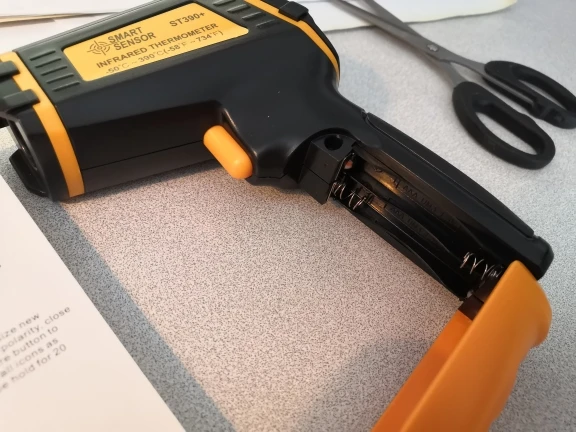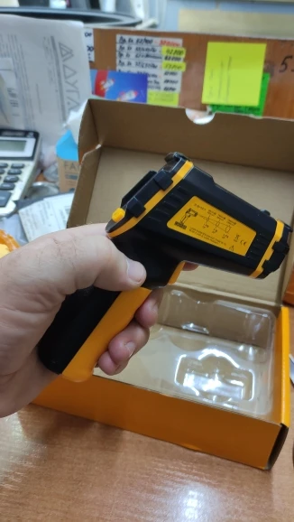 Очень хороший пирометр. Цвет и пластик на высшем уровне. В руке лежит удобно, удобное управление. Есть возможность отключать лазер и настраивать EMS. Имеются сигнализации по максимуму и минимуму температур. Однозначно рекомендую. В комплекте нет батареек. Это промышленный пирометр, поэтому померять температуру у человека не получится.