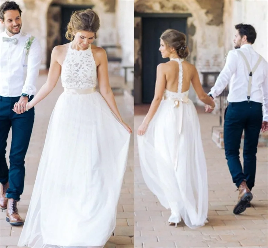 Женское свадебное платье с лямкой на шее, кружевное пляжное платье для невесты