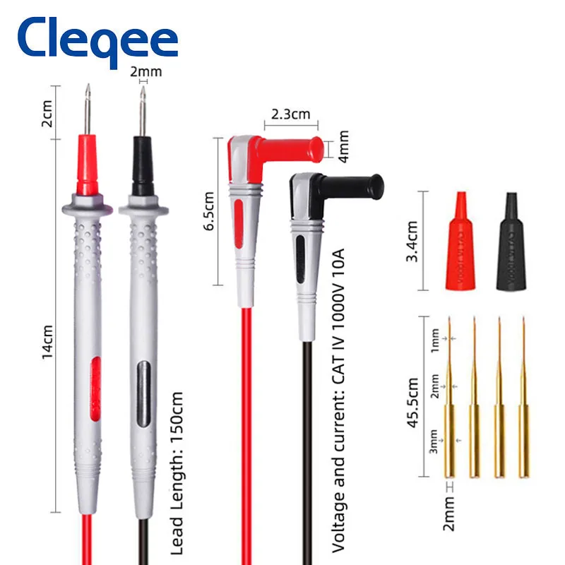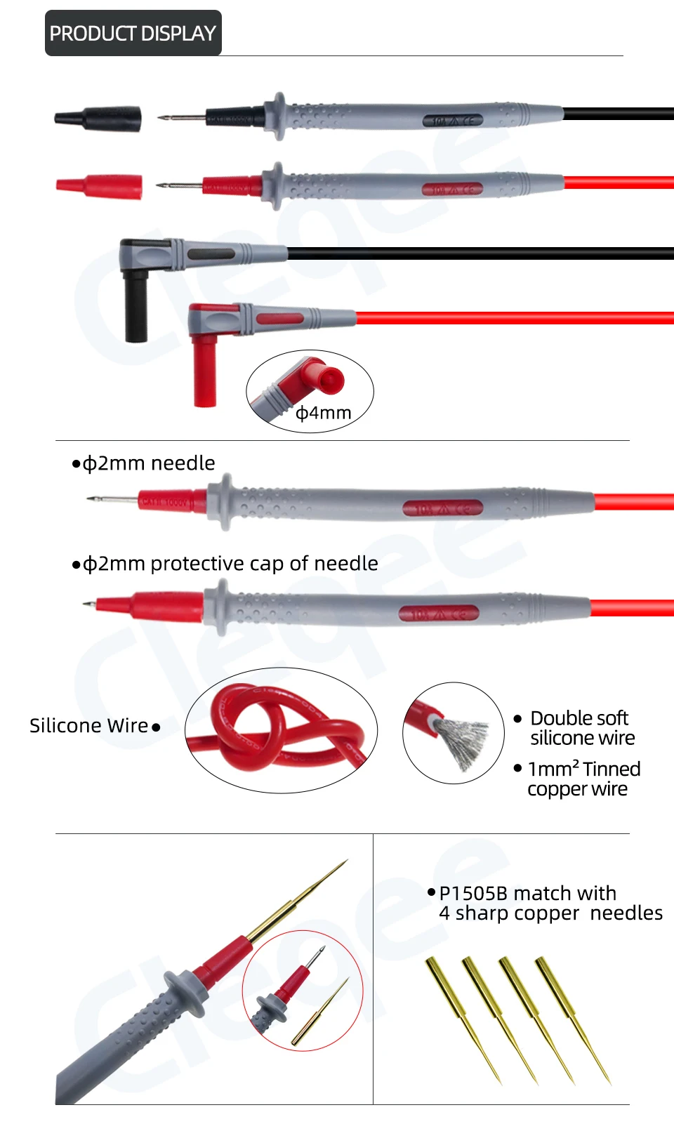 Тестовый провод Cleqee P1505B с двойным силиконовым слоем, датчики для мультиметра, 4 мм, штекер типа банан, острый, Запасные иглы, 1,5 м, 1000 В10 А