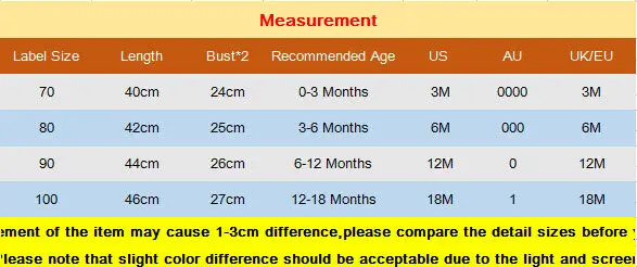 Размеры Длина Размер бюста * 2 Возраст 70 40 см 24 см 0-3 месяца 80 42 см 25 см С диагональю экрана 3-6 месяцев 90 44 см 26 см 6-12 месяцев 100 46 см 27 см 12-18 месяцев