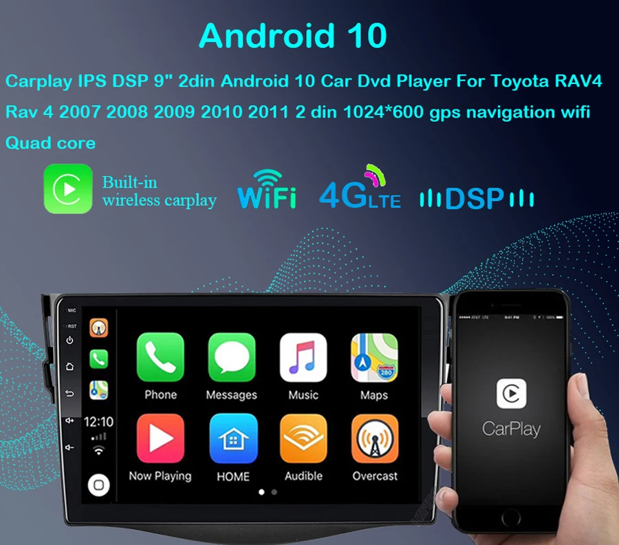 Автомобильный Dvd-плеер, Android 10, для Toyota RAV4, Rav 4, 2007, 2008, 2009, 2010, 2011, 2 din, 1024*600, gps-навигация, Wi-Fi, четырехъядерный